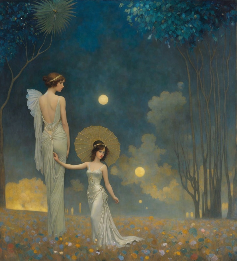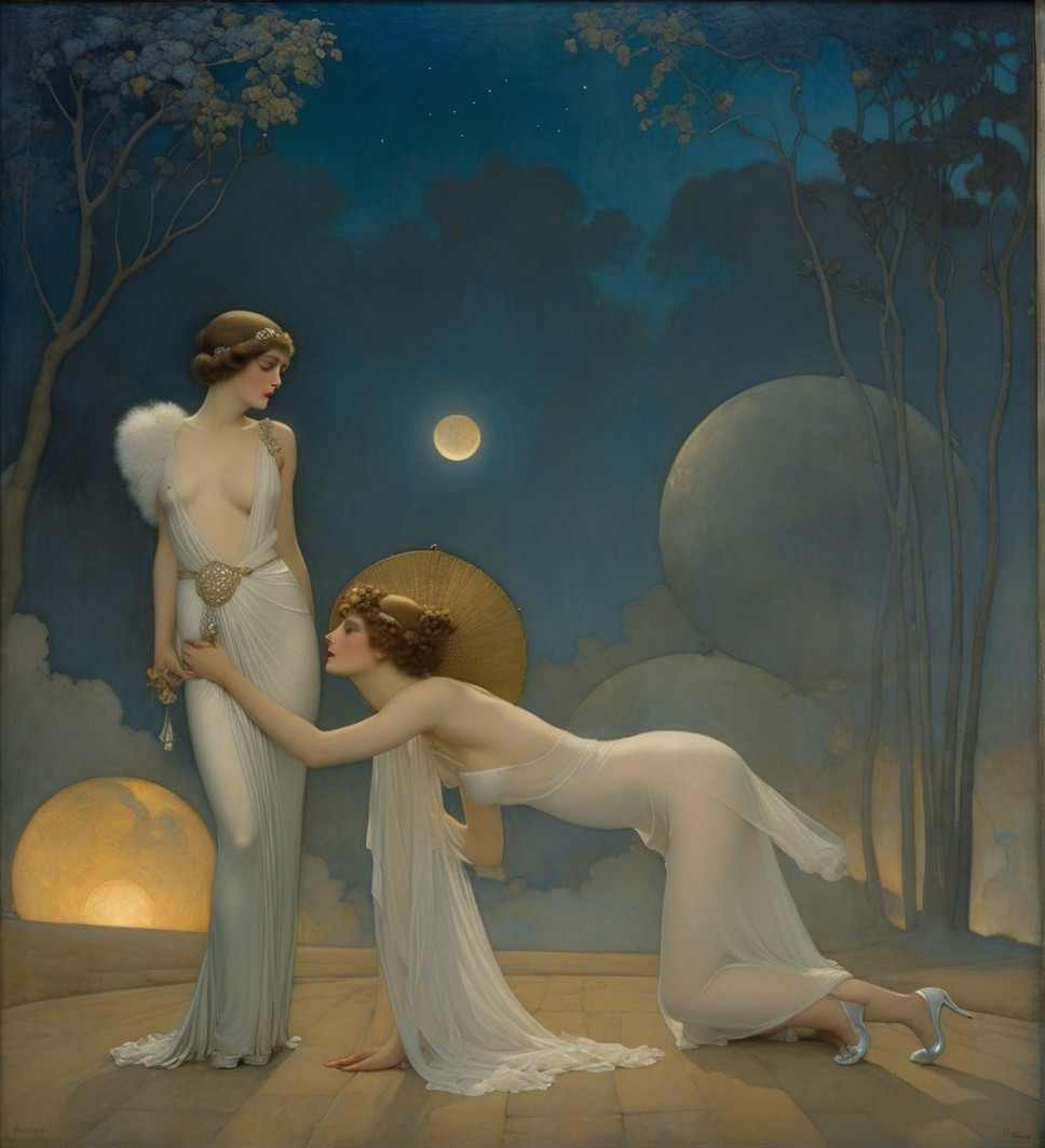 In a dreamlike landscape, two elegantly dressed women interact beneath a starry night sky with celestial bodies and soft light illuminating their serene poses and ethereal gowns.