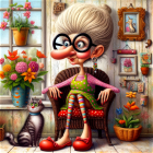 A stylish woman with long, blonde hair and glasses sits in a cozy chair, wearing a dotted blue dress. Beside her, a gray and white cat relaxes. Colorful plants surround the inviting space.