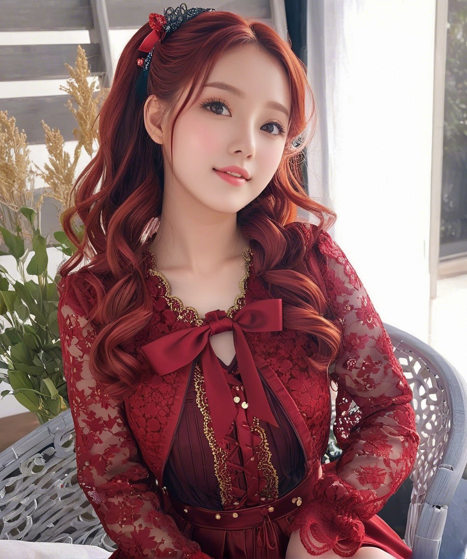 A young woman with long, wavy red hair styled with a floral accessory. She wears a rich red dress adorned with lace and ribbons, sitting gracefully in a bright, airy room.
