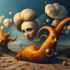 A surreal landscape features abstract figures: a horned creature, a whimsical snail, and disembodied heads amidst clouds and flowers, creating a dreamlike, imaginative scene.