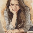 A young woman with long, dark hair sits at a desk, focused on her laptop. She rests her chin on her hand, surrounded by a cup of coffee and scattered notes, in a warm, sunlit room.