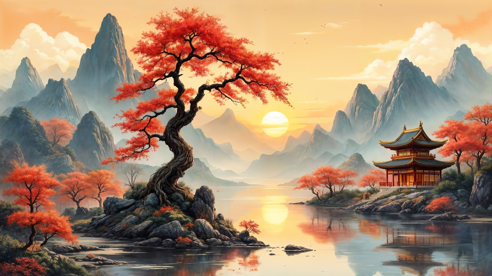 A vibrant, highly detailed painting in 8K resolution, featuring a stylized Japanese landscape at sunset. The scene is dominated by a majestic, gnarled tree with brilliant red autumn leaves on the left, its roots clinging to a rocky outcrop in the foreground. To the right, a traditional Japanese pagoda