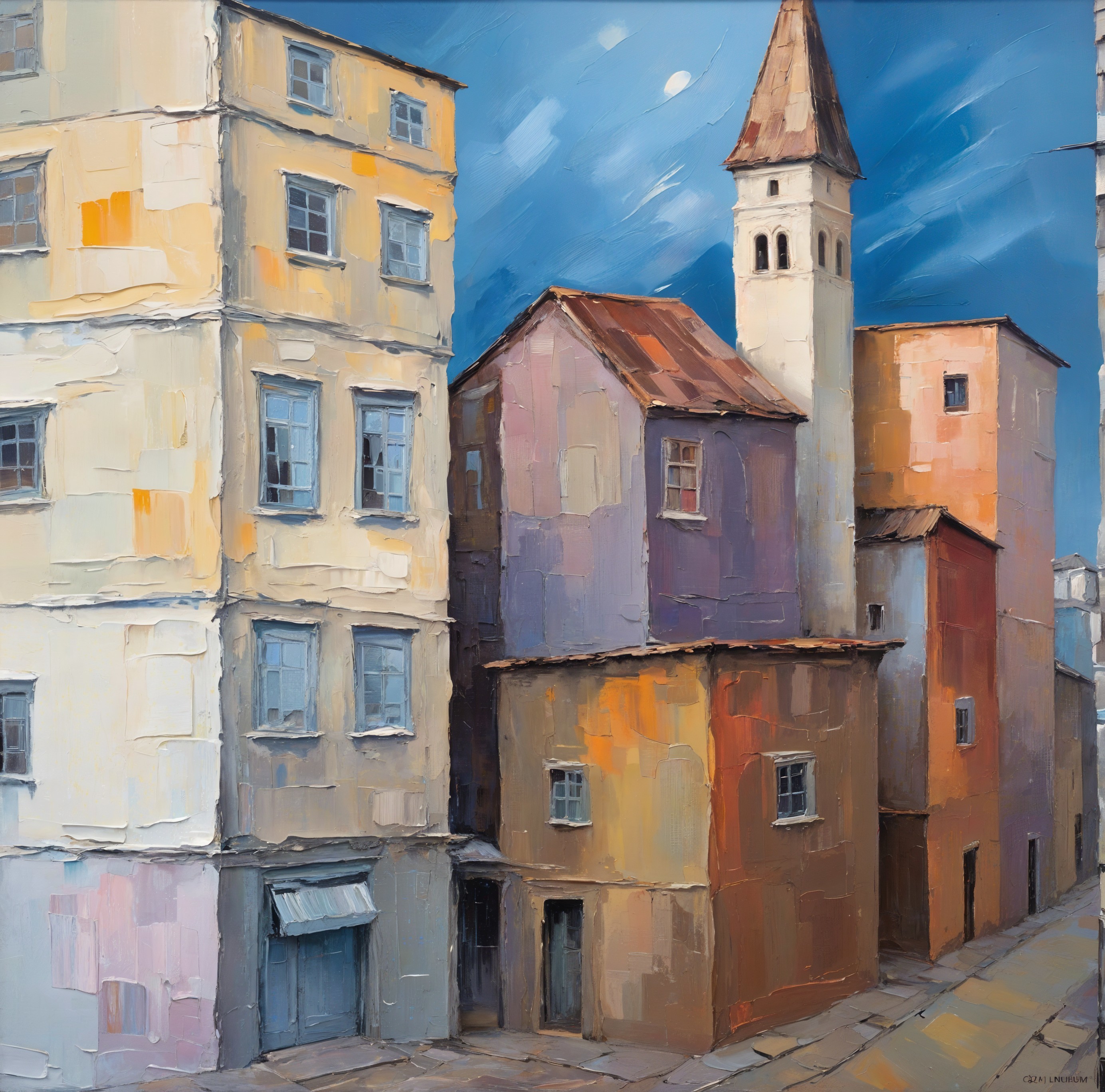 A vibrant, textured painting of colorful buildings with a mix of warm and cool hues. The scene features a charming clock tower under a moonlit sky, exuding a serene, quaint atmosphere.