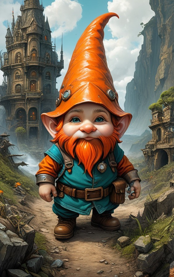 A whimsical gnome with a bright orange hat and a bushy beard stands confidently on a path, framed by a grand castle and rugged mountains in a vibrant fantasy landscape.