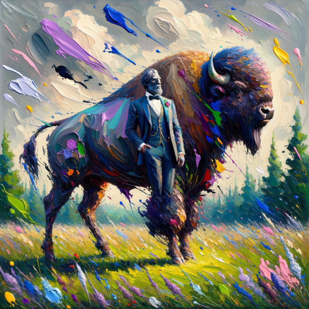 A captivating abstract expressionism artwork featuring an American bison in a suit amid a meadow. Vibrant colors, forceful brush strokes, intricate details, and chaotic harmony create an award-winning masterpiece trending on Artstation. The painting exudes dynamic energy and emotion, reminiscent of Harrison Ford's style.