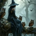A dark, mystical forest sets the scene as a woman in a flowing black gown and pointed hat sits on a branch, surrounded by a group of owl companions, with bats flying in the foggy background.