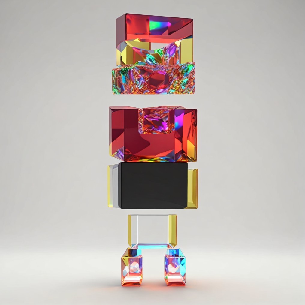 Three stacked, glowing, geometric shapes with a holographic texture against a neutral background, resembling a modern art sculpture.