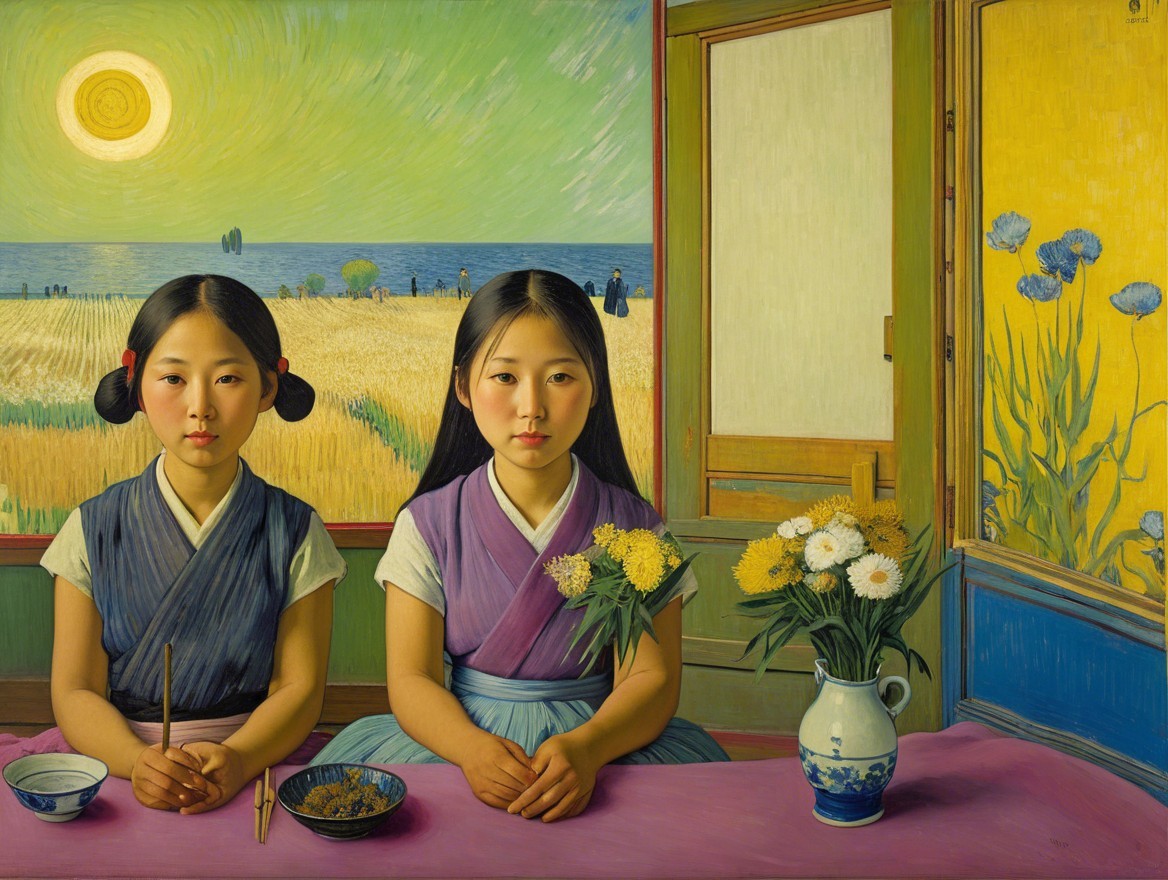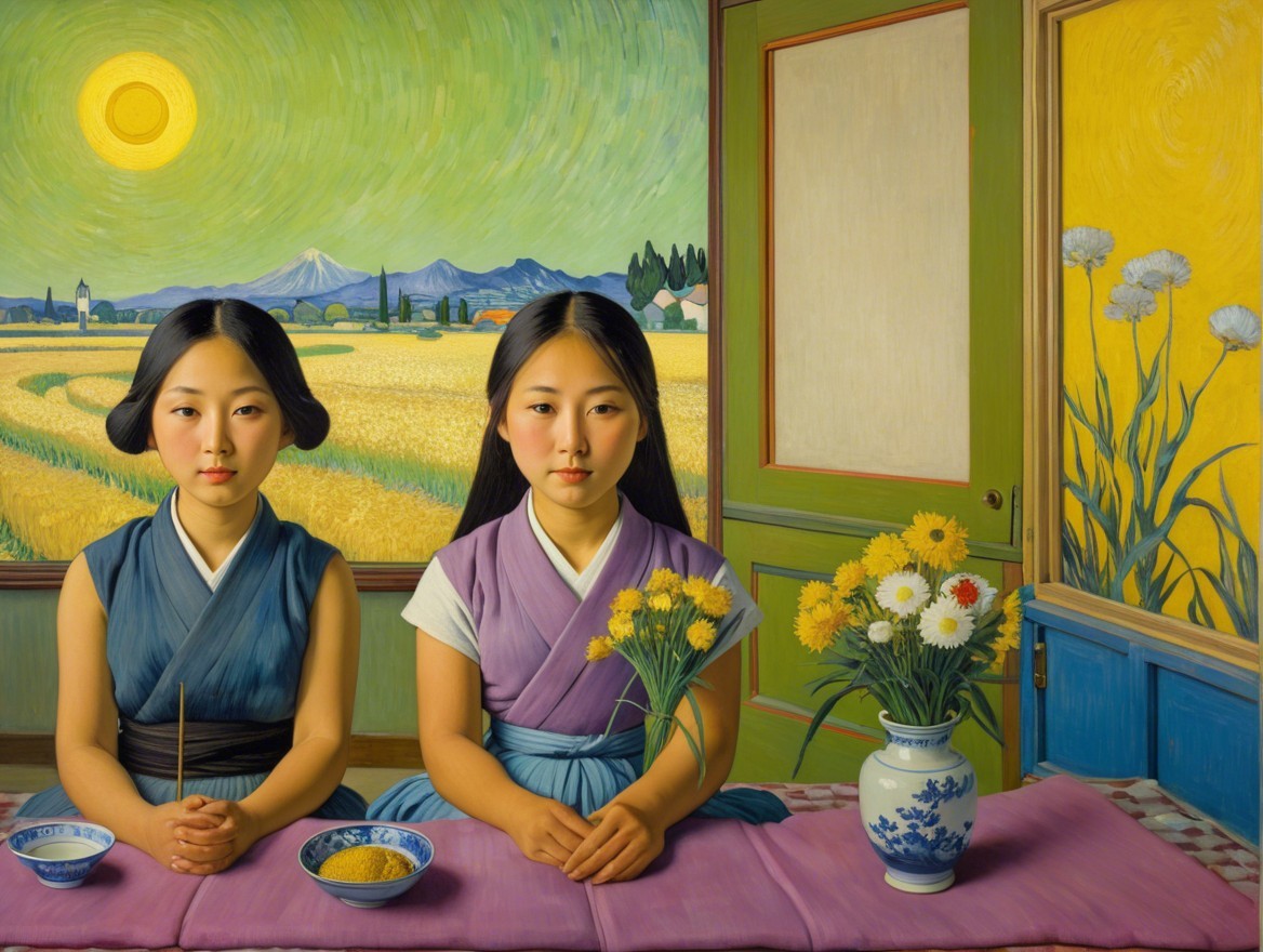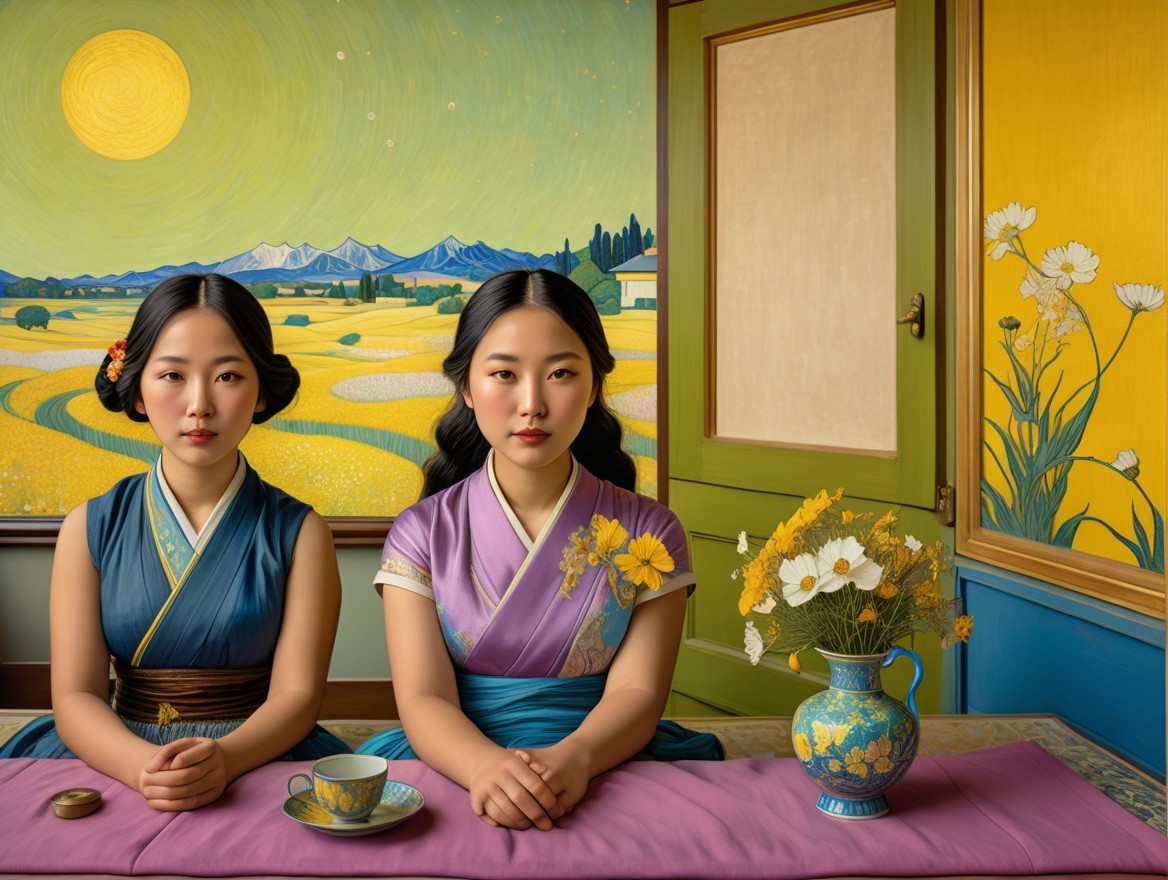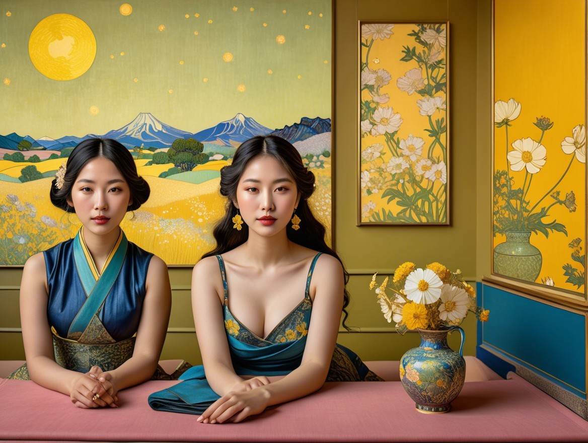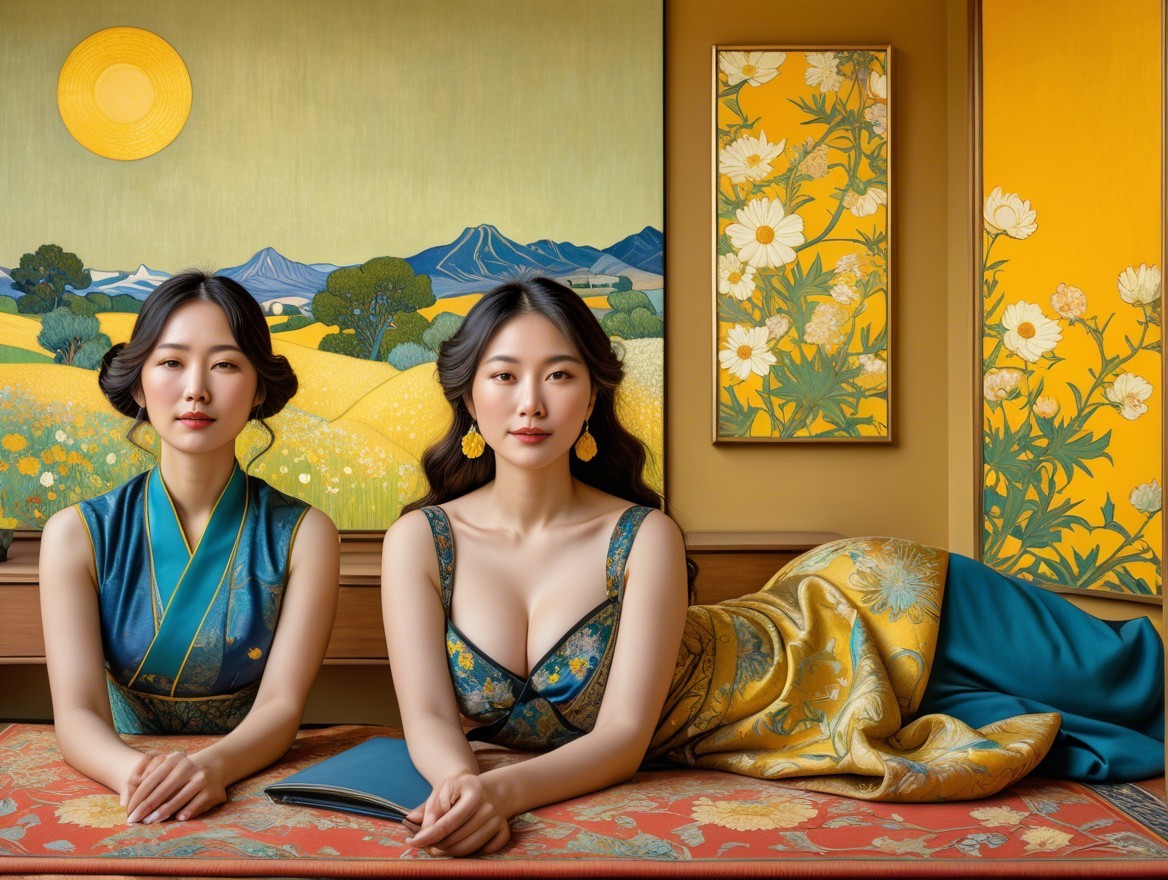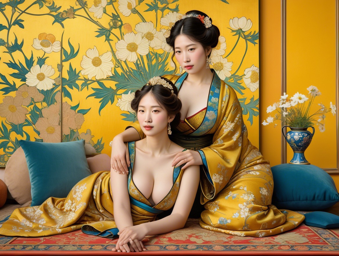 A group of six women wears vibrant, traditional garments in varying styles and colors. Rich fabrics and layered silhouettes create a striking visual against a warm, textured backdrop.