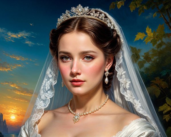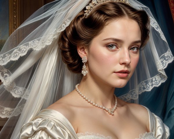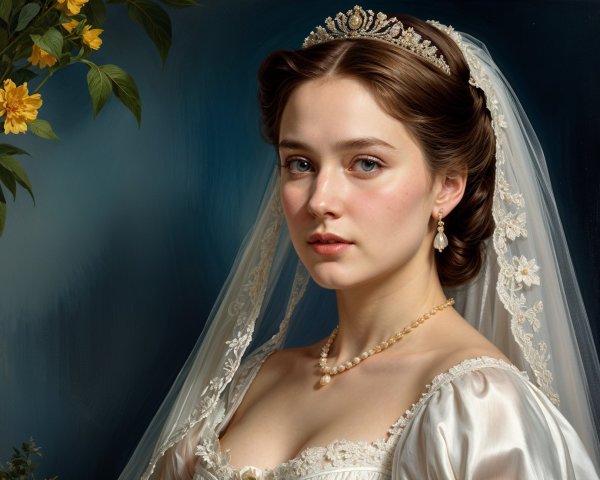 A portrait of a woman with elaborate golden jewelry and headdress, featuring pearls and gems, and a regal expression.