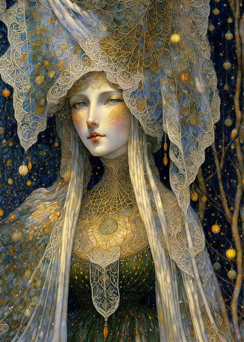 A ethereal woman in an ornate gown, adorned with a spiderweb motif and glowing orb, surrounded by delicate webs and autumn leaves, exudes a mystical, enchanting aura.