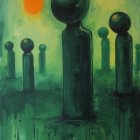 The painting features tall, abstract figures with rounded heads, set against a textured green background. A bright orange sun emerges, creating a surreal, contemplative atmosphere.
