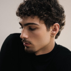 A close-up portrait of a young man with short, tousled hair, wearing a black shirt. A stylized sun graphic is placed on his cheek, adding a playful yet artistic touch to the image.