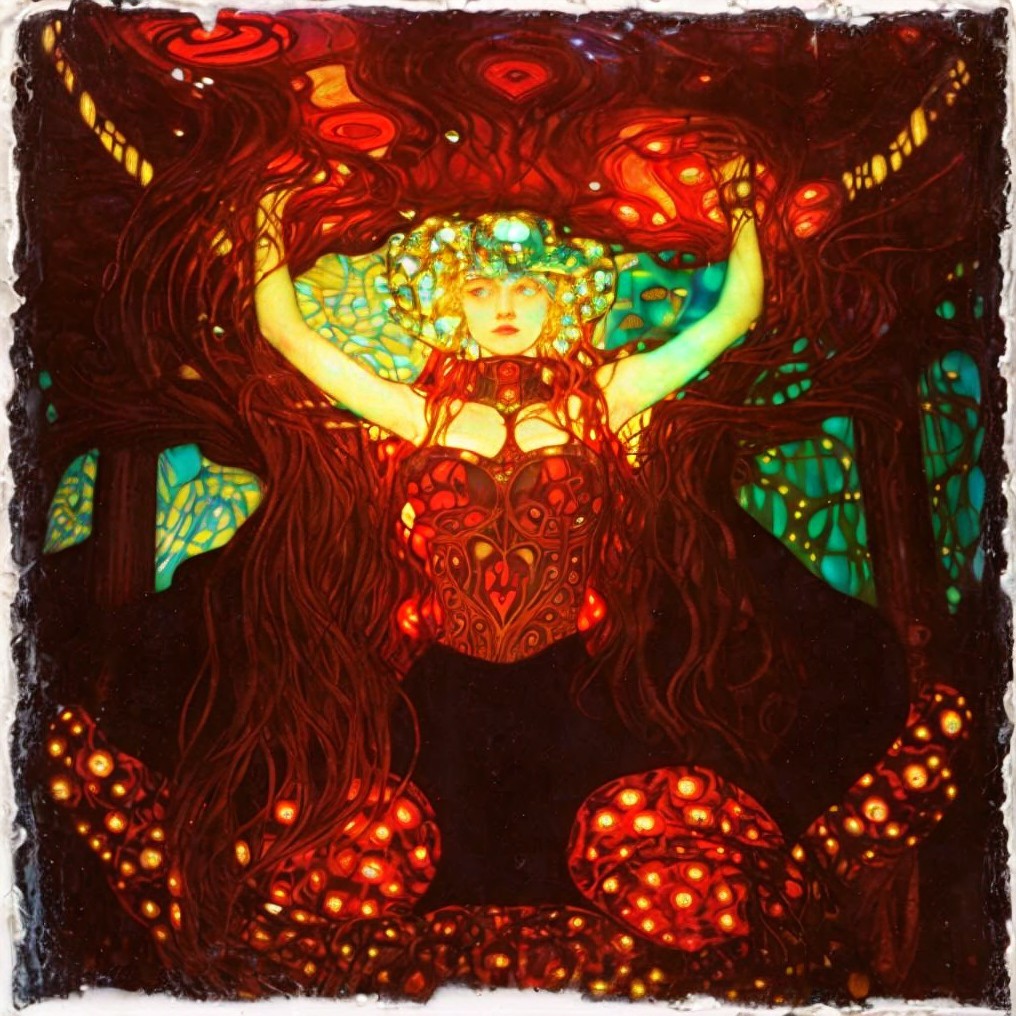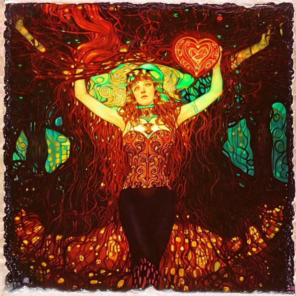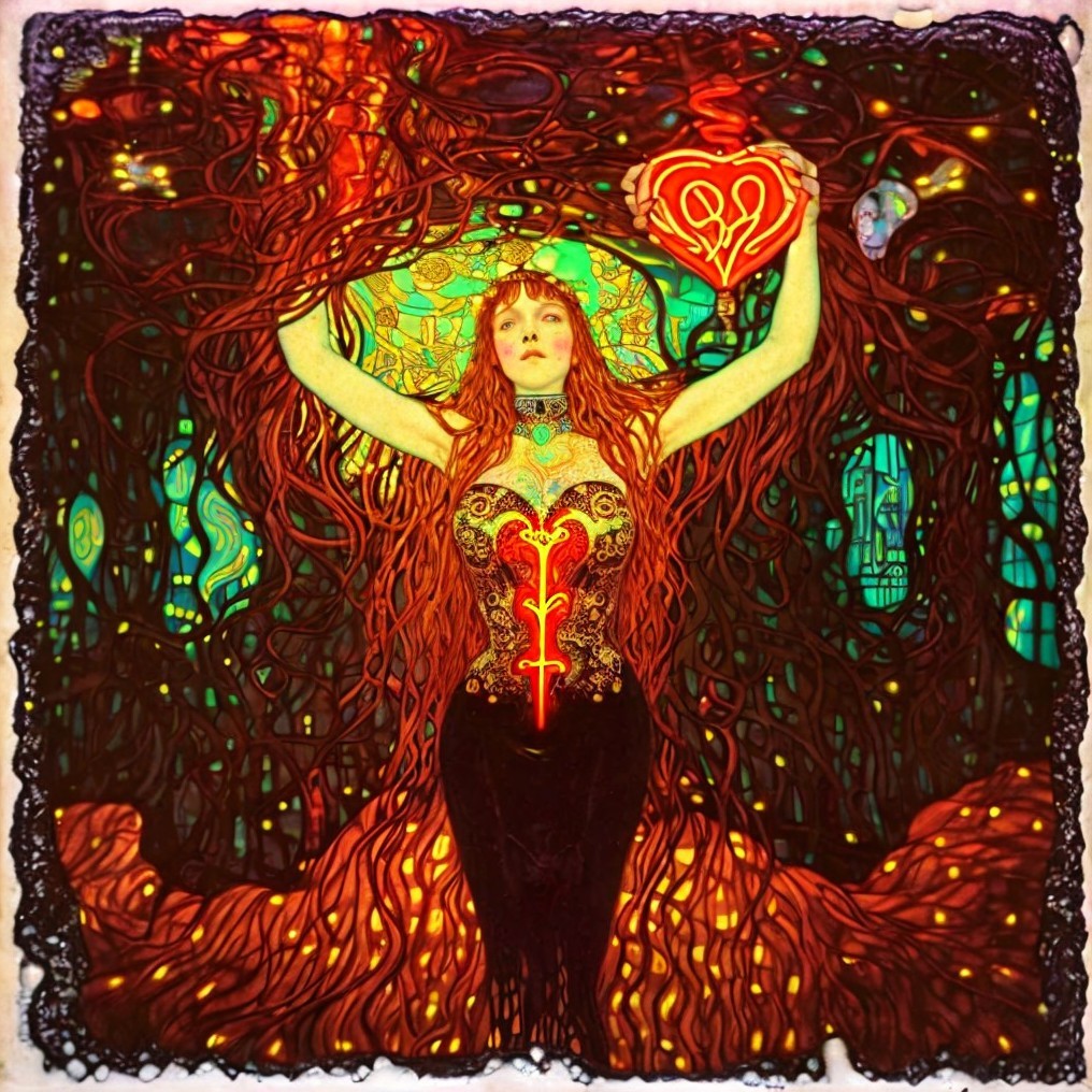 Stylized illustration of woman with flowing hair and ornate headpiece holding glowing heart emblem