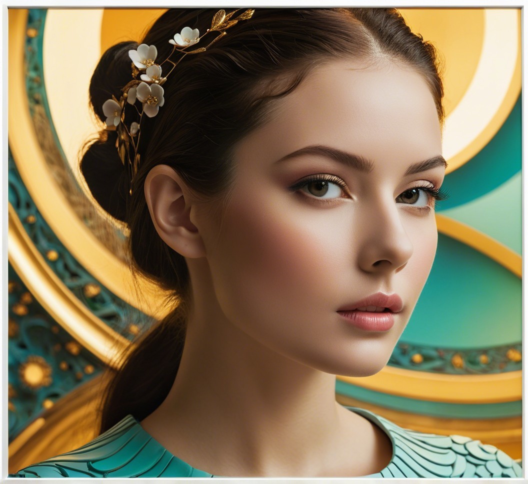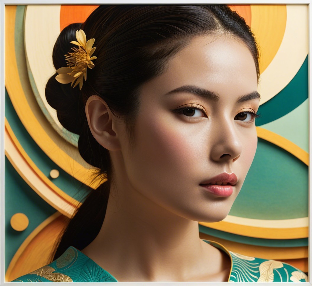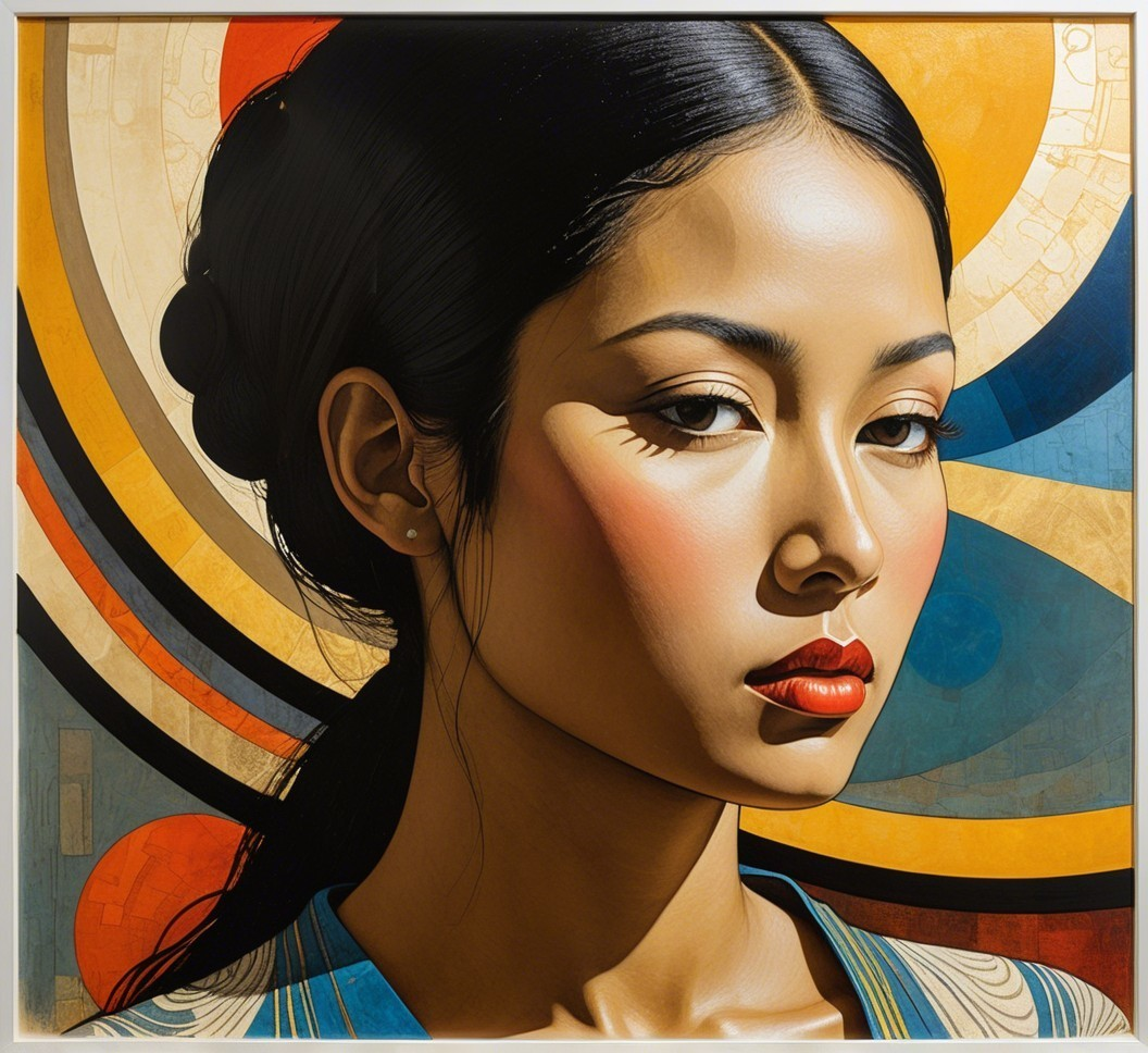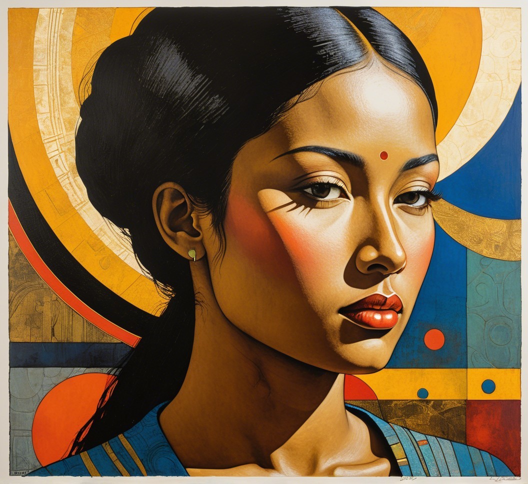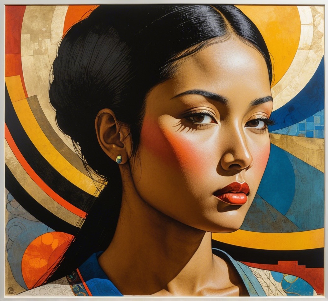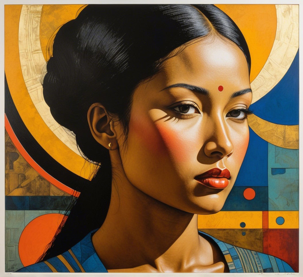 A stunning portrait of a young woman with dark hair, featuring vibrant geometric patterns in warm colors. Her serene expression contrasts with the bold backdrop, creating a harmonious visual impact.