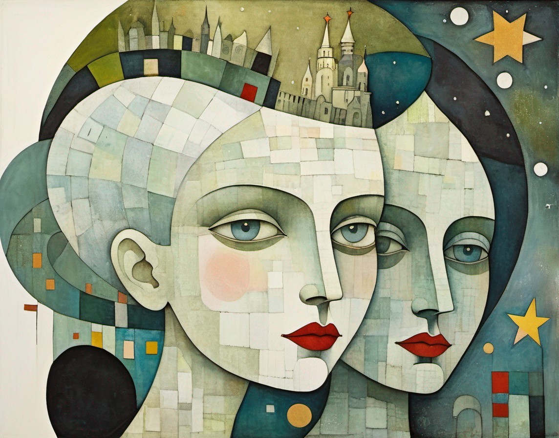 A cubist style painting featuring two stylized faces with geometric shapes and muted colors, accented by celestial motifs.