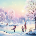 Two girls skate on a frozen lake, surrounded by snowy trees and a tranquil winter landscape. A playful dog joins them, while a distant house is nestled among the frosty scenery.