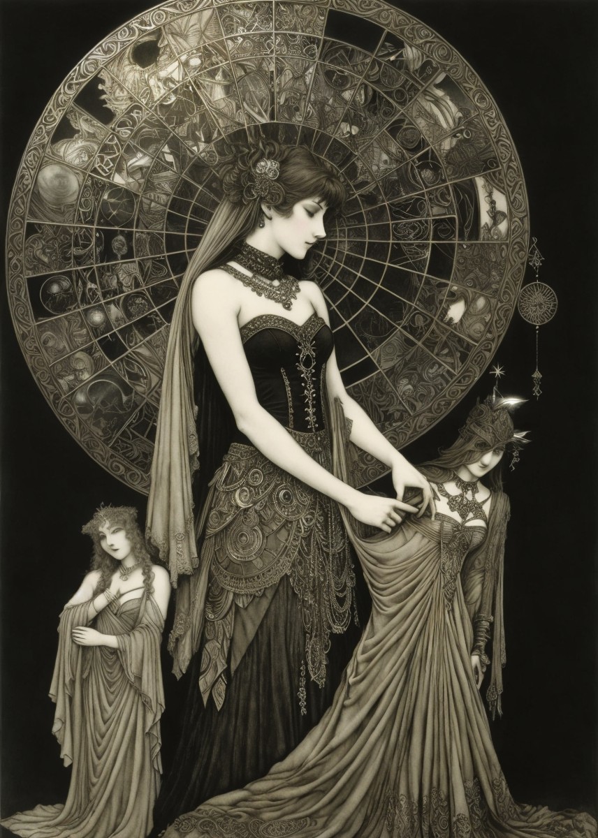 A elegantly dressed woman in a dark gown with intricate details sits gracefully. She has striking red hair adorned with feathers, framed by a large, ornate circular backdrop.