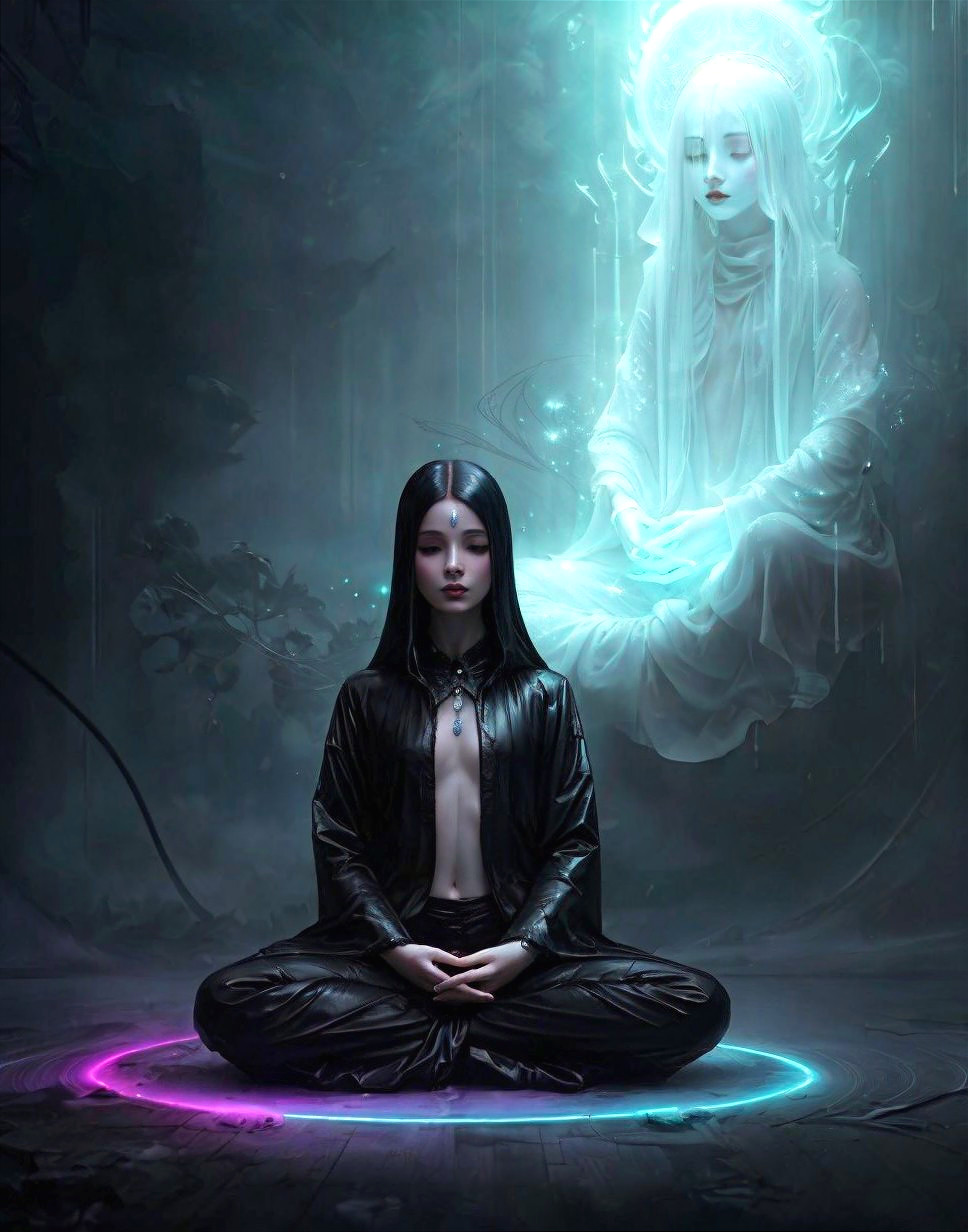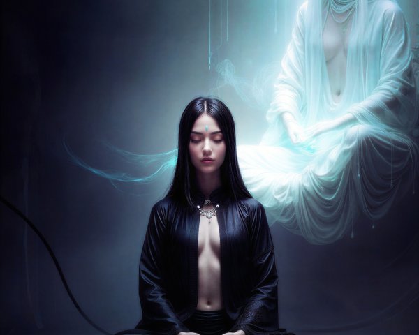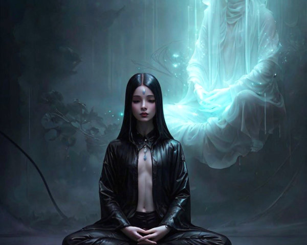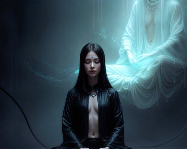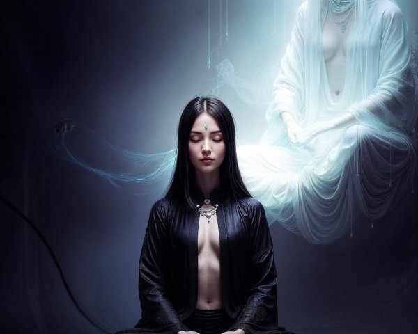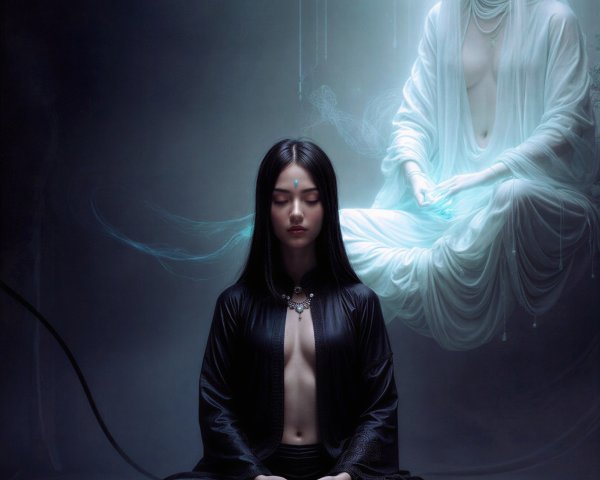 A serene scene featuring a woman meditating in dark attire, surrounded by a glowing circular aura. Above her, a ghostly figure in flowing white appears, embodying tranquility and wisdom.