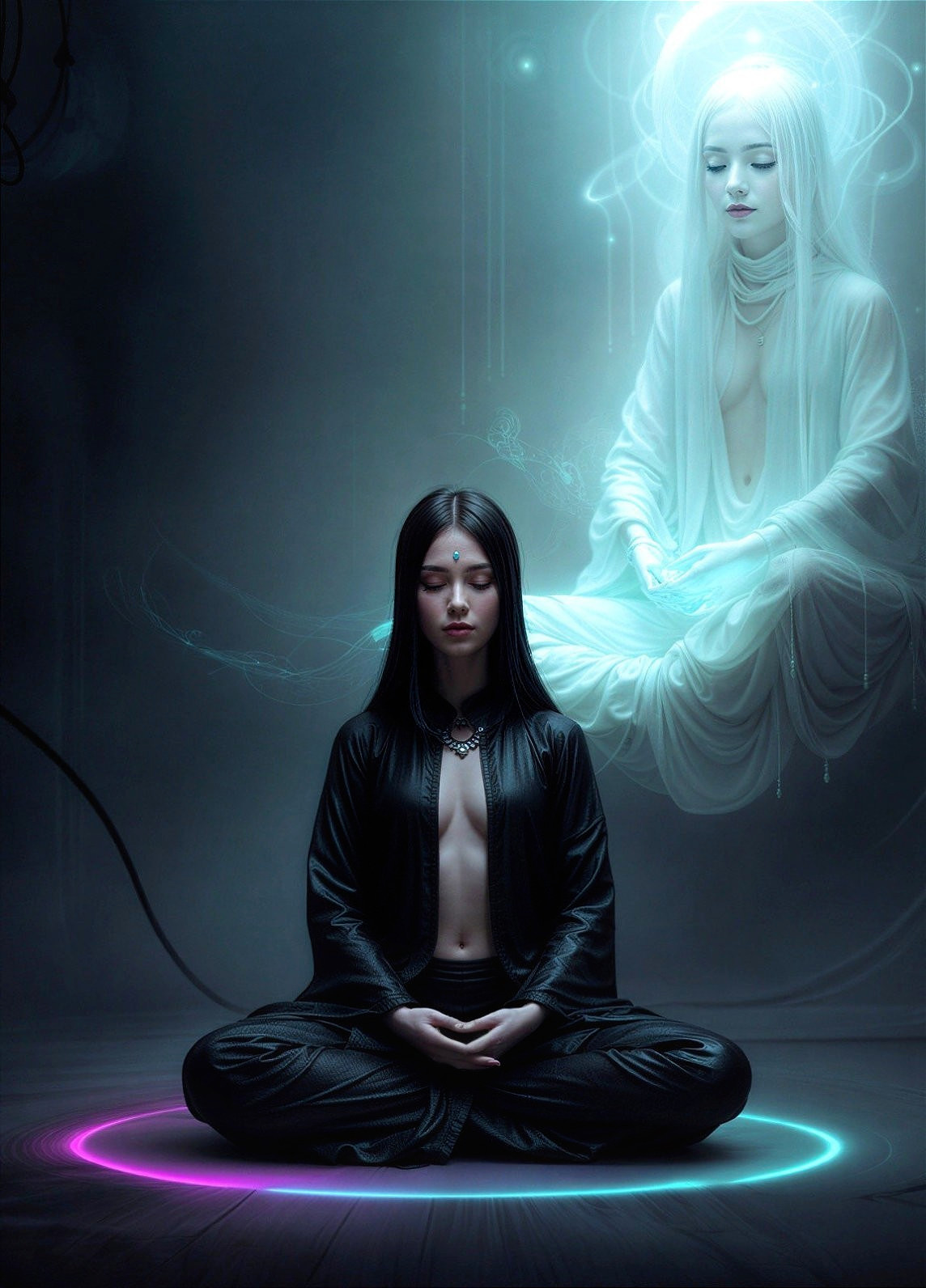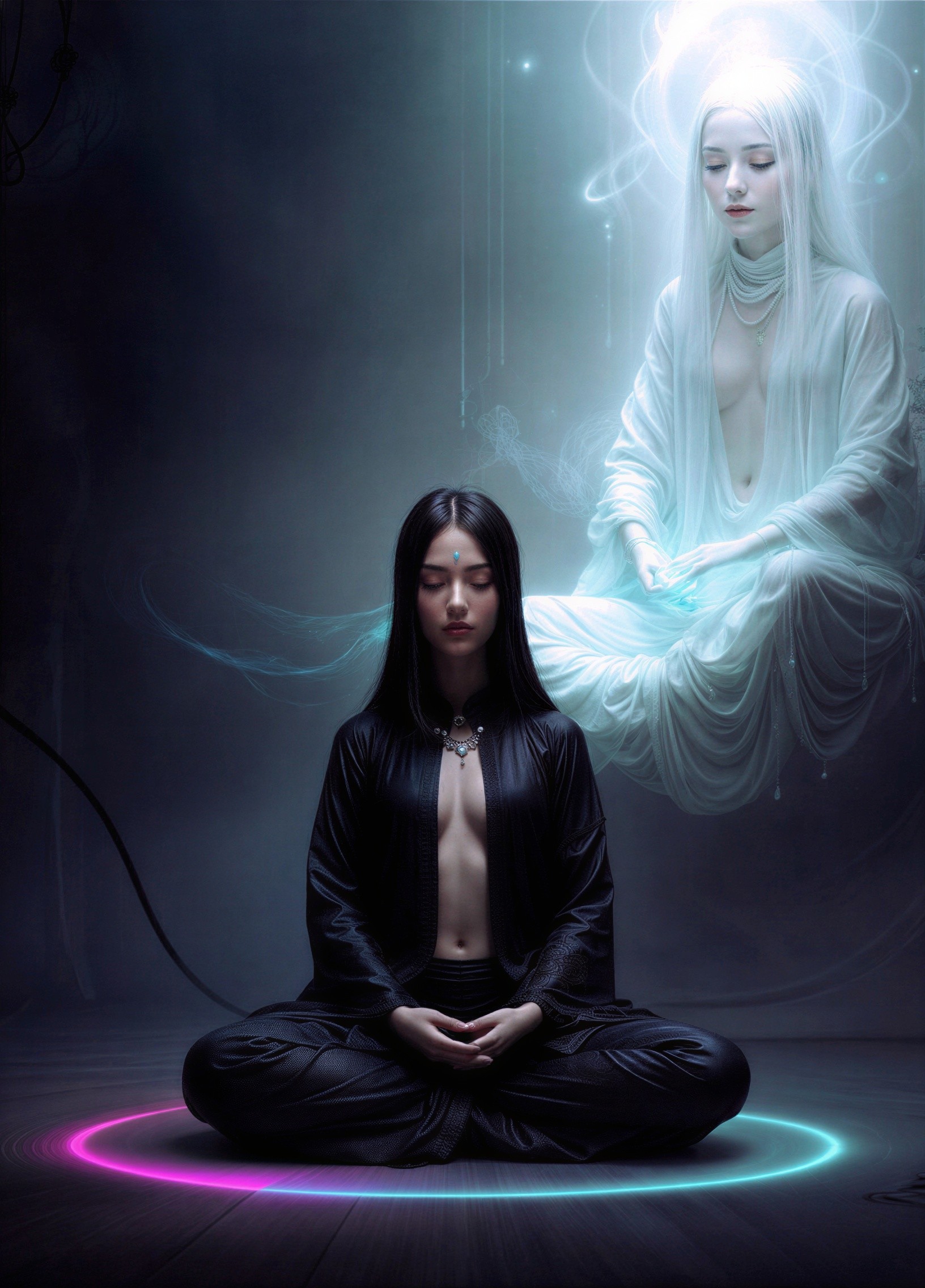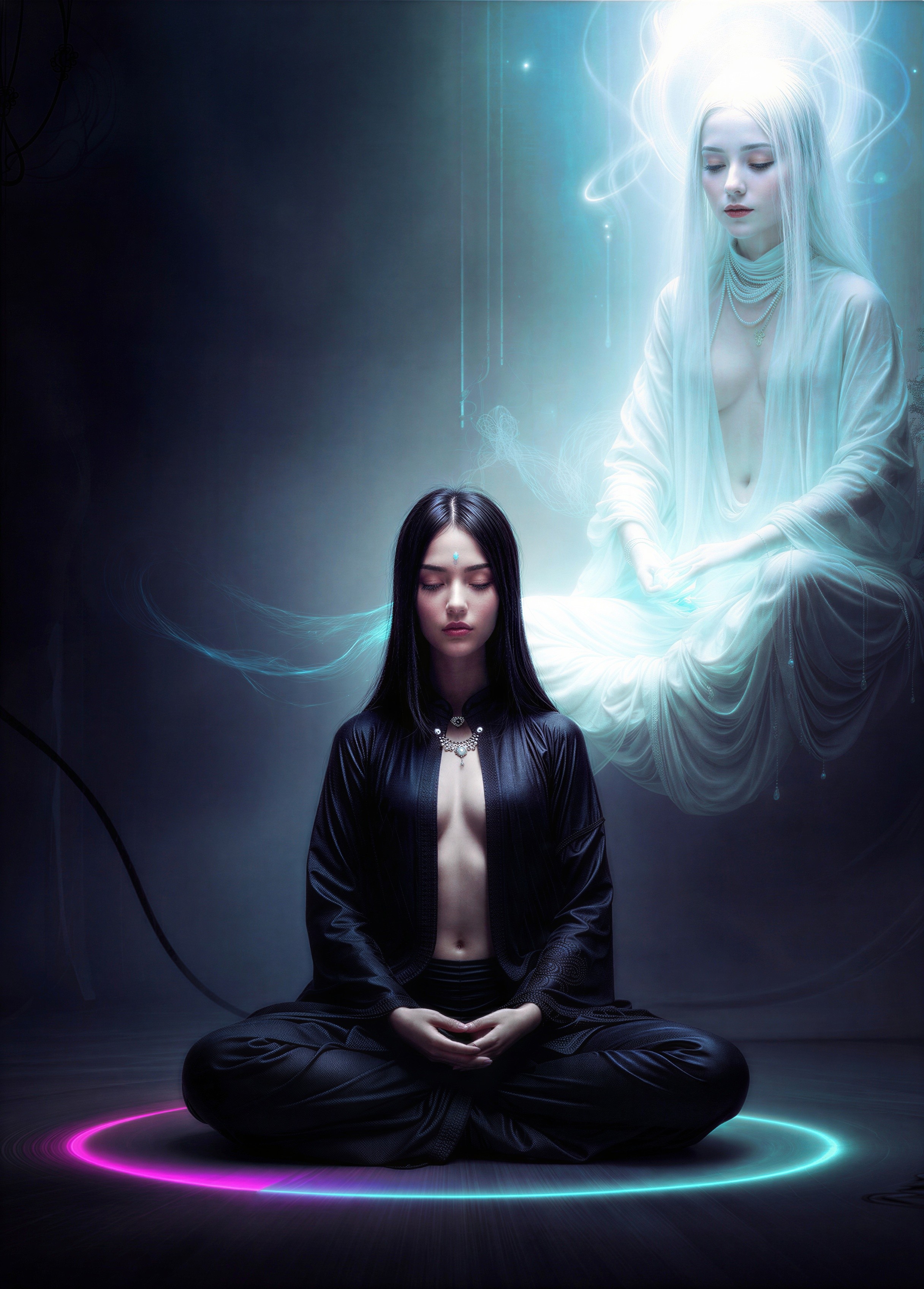 A serene scene featuring a woman meditating in dark attire, surrounded by a glowing circular aura. Above her, a ghostly figure in flowing white appears, embodying tranquility and wisdom.