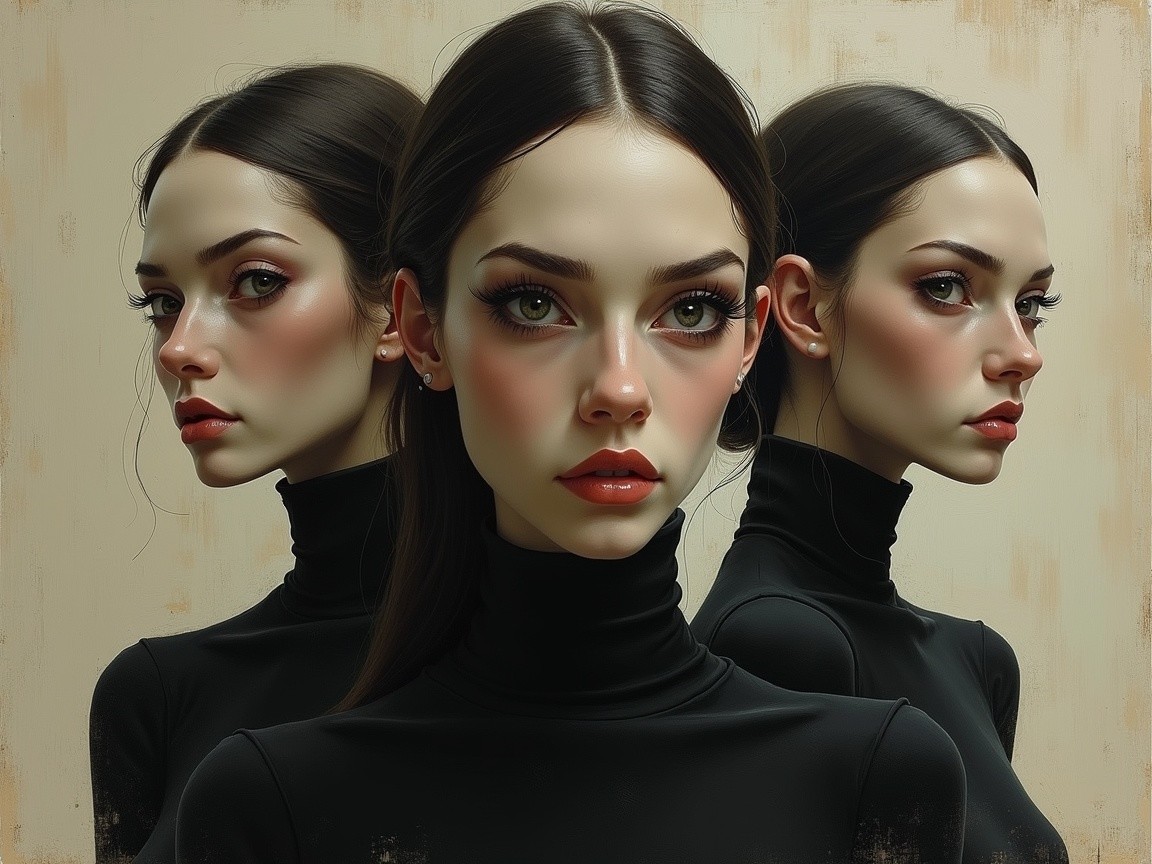 Elegantly melancholic woman, with black hats, elongated figures, somber color palette, expressive brushstrokes, haunting eyes, angular features, Parisian chic attire, minimalist background, emotional depth, dramatic lighting, modern interpretation, textured surfaces, masterful composition, introspective mood, evocative atmosphere, artful simplicity, by Bernard Buffet, high-resolution digital painting.