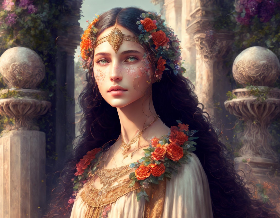 Gateway between dreams with a beautiful young girl in old Roman clothes flowers in her hair
