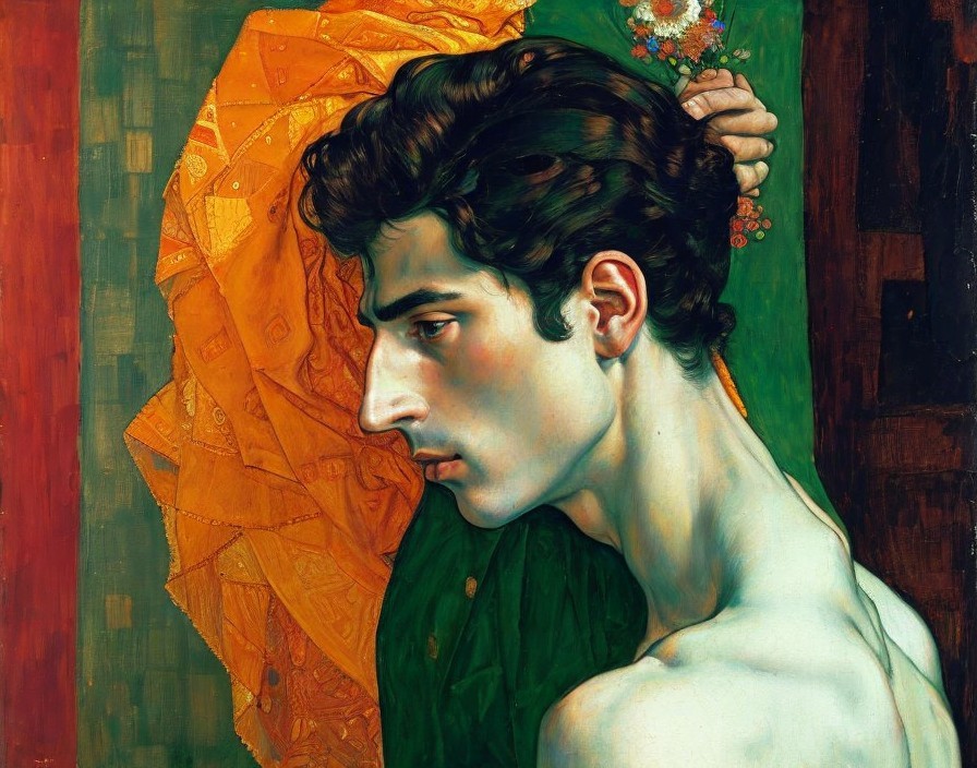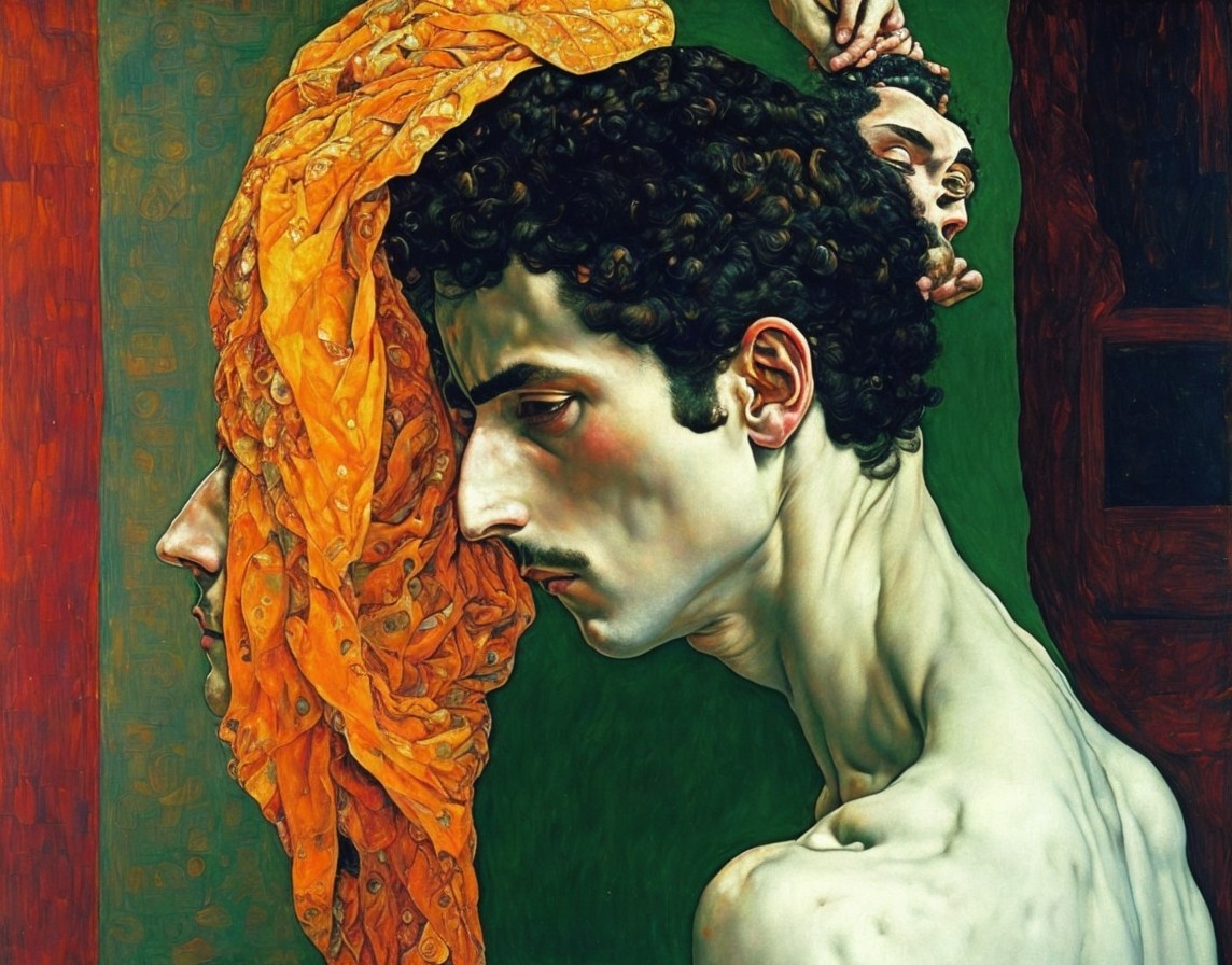 A detailed painting of a curly-haired man in profile with a hand resting on his head holding a vibrant orange fabric.