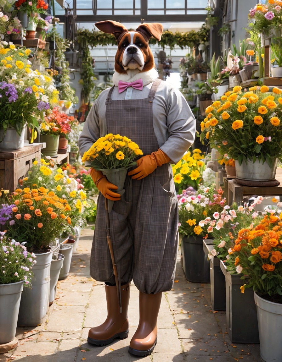Prompt: "Anthropomorphic, humanoid: easter bunny big brown humanoid St. Bernard dog, male, wearing a grey gardener's dress, grey gardener's clothes, orange rubber boots on feet, wearing gloves, autumn feeling, autumn sunlight, standing in a beautiful huge flower shop, yellow flowers, red flowers, pink flower, plants, (anthropomorphic), humanlike, anthropoid, anthropomorph, chimera, full body, head to toe, (no human face)"