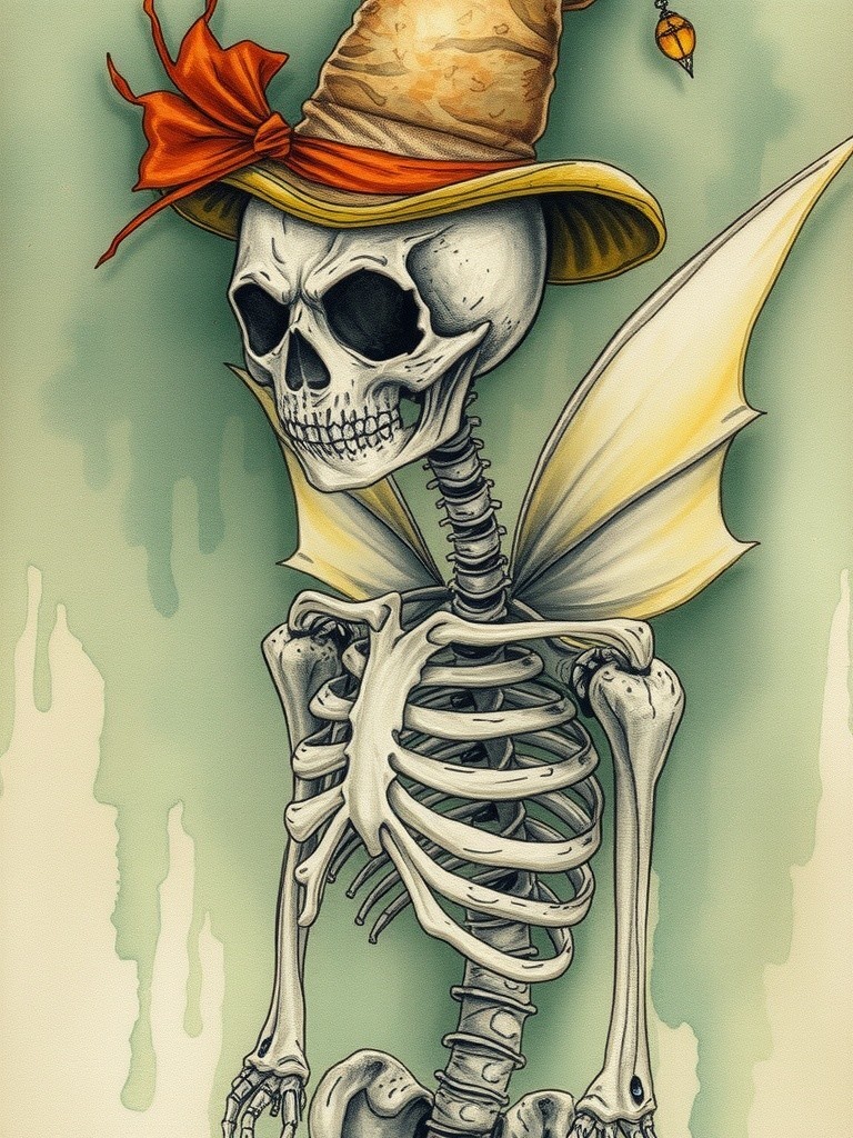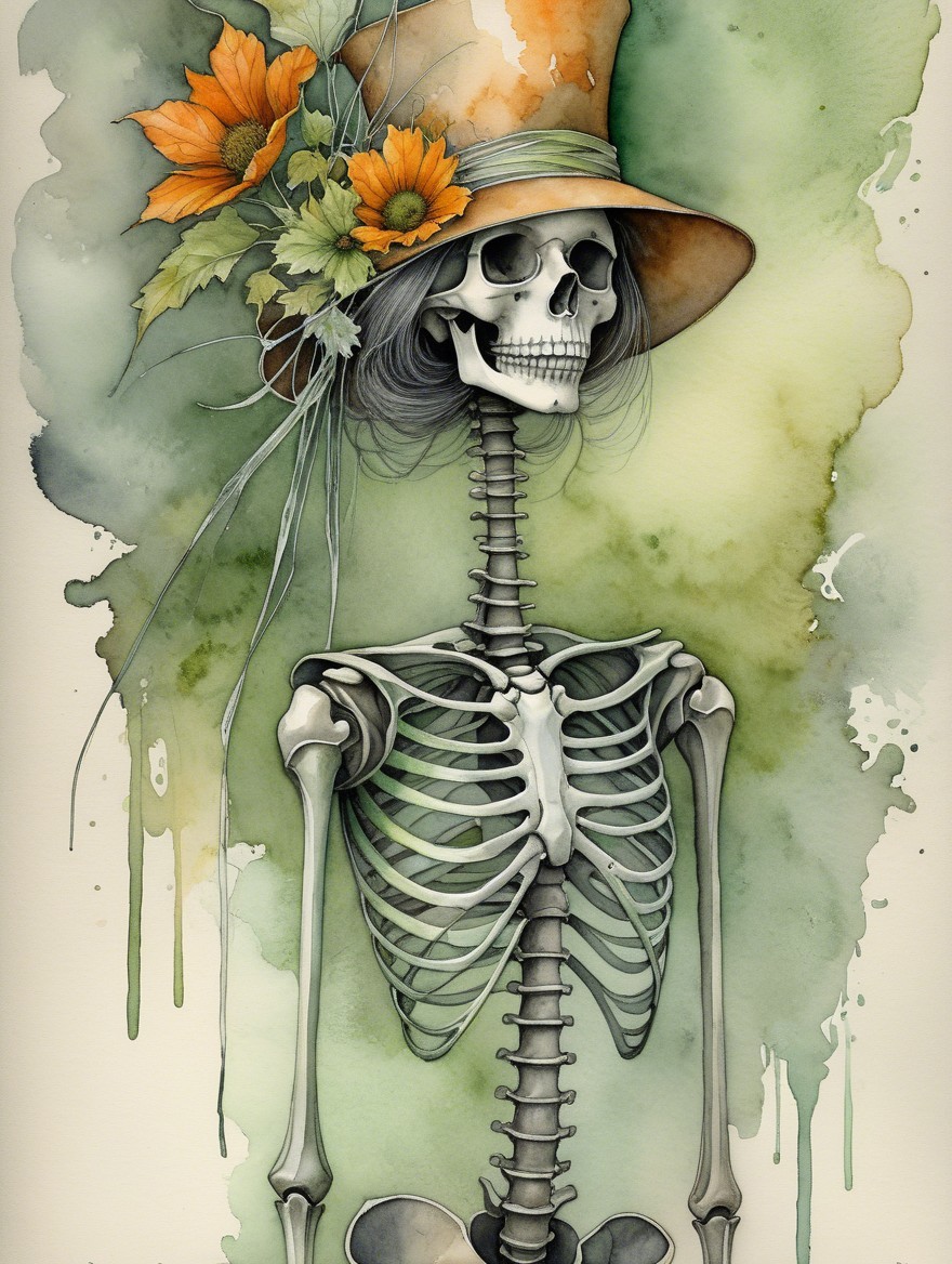 A whimsical skeleton wears a straw hat adorned with sunflowers. The background features soft, splattered greens and blues, creating a playful, artistic vibe. Perfect for a quirky autumn theme!
