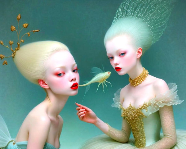 A surreal figure sits gracefully, wearing a black tulle tutu and a unique headpiece shaped like a clock. The setting features soft pastel walls, enhancing the dreamlike atmosphere.