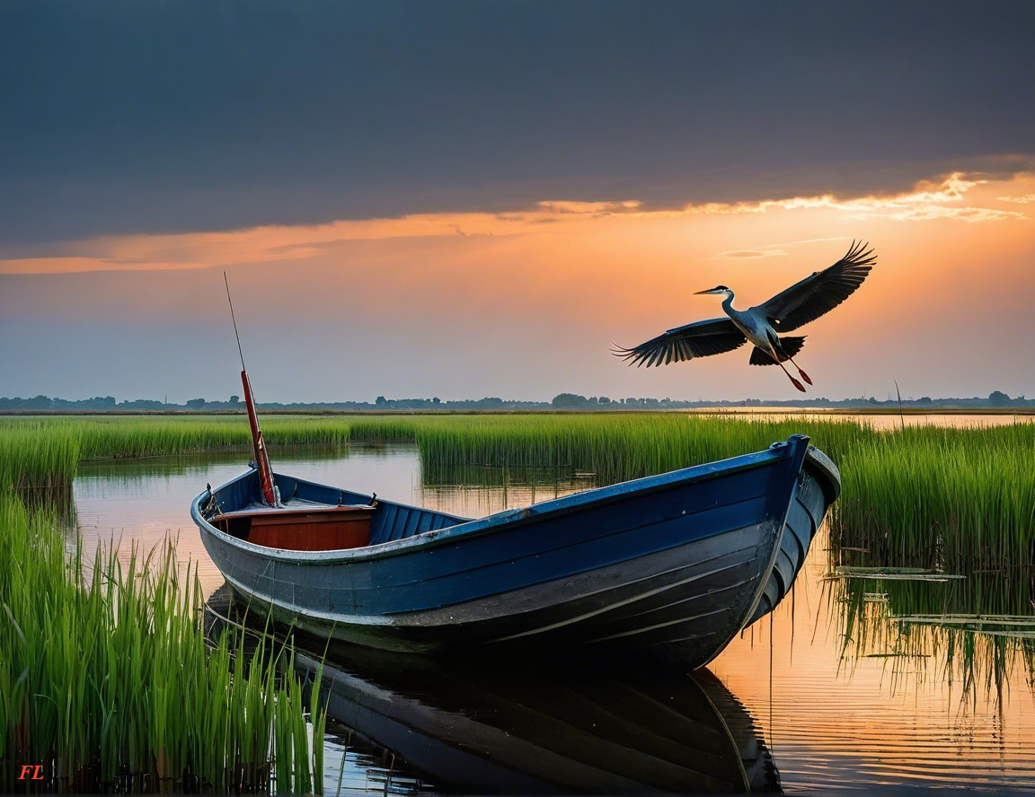 Description : A tranquil lake scene at sunset with a boat and a bird in flight against an orange-tinged sky and green reeds.