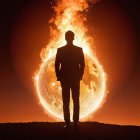A silhouetted figure in a suit stands against a dramatic backdrop of a fiery sun setting behind a horizon, creating a striking contrast of light and shadow. The scene evokes power and intensity.
