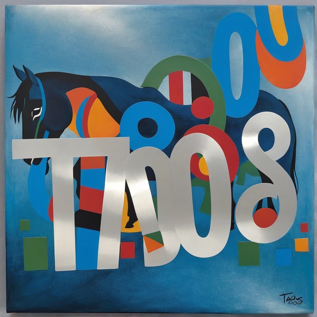 The image features two stylized horses in bold colors against a blue background, with geometric shapes and a shiny silver number "7708" prominently displayed in the foreground.