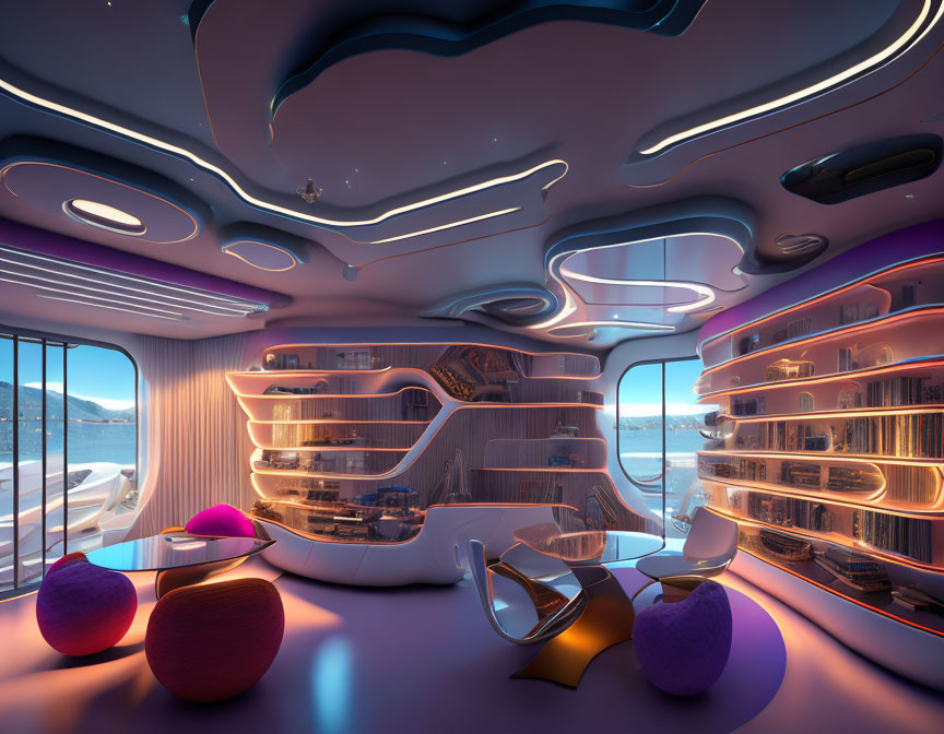 + Prompt:Futuristic interior with futuristic furniture, bookcases, concept art with 16L resolution, extremely detailed, high definition, photorealistic