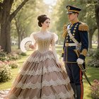 A woman in an elegant, vintage gown with lace details holds a fan, standing in a serene park beside a man in a military uniform, both radiating a timeless, romantic vibe under soft sunlight.