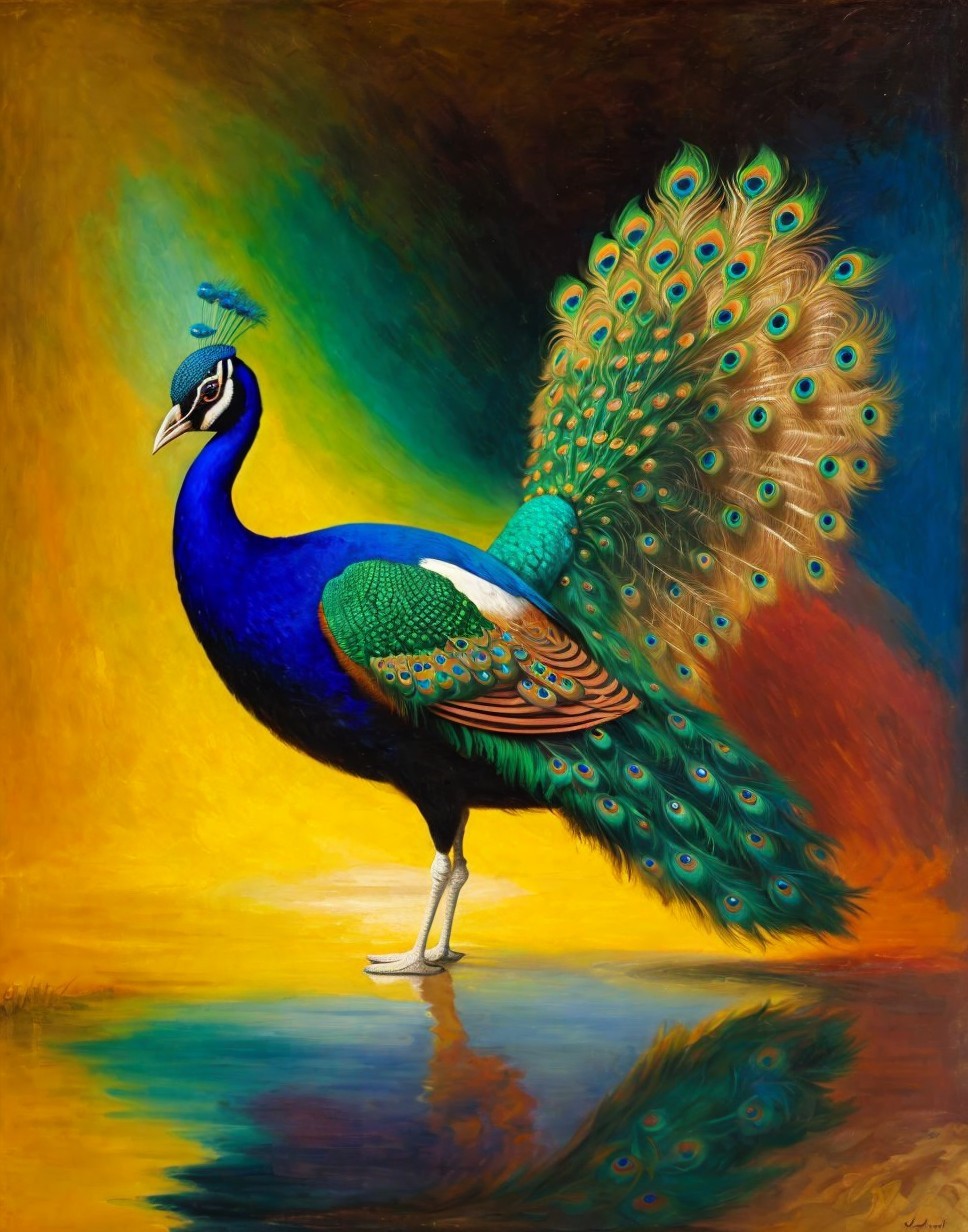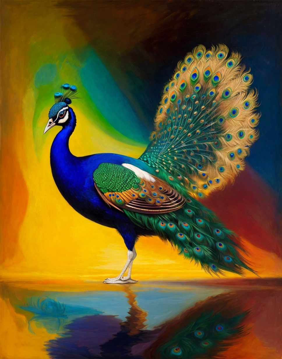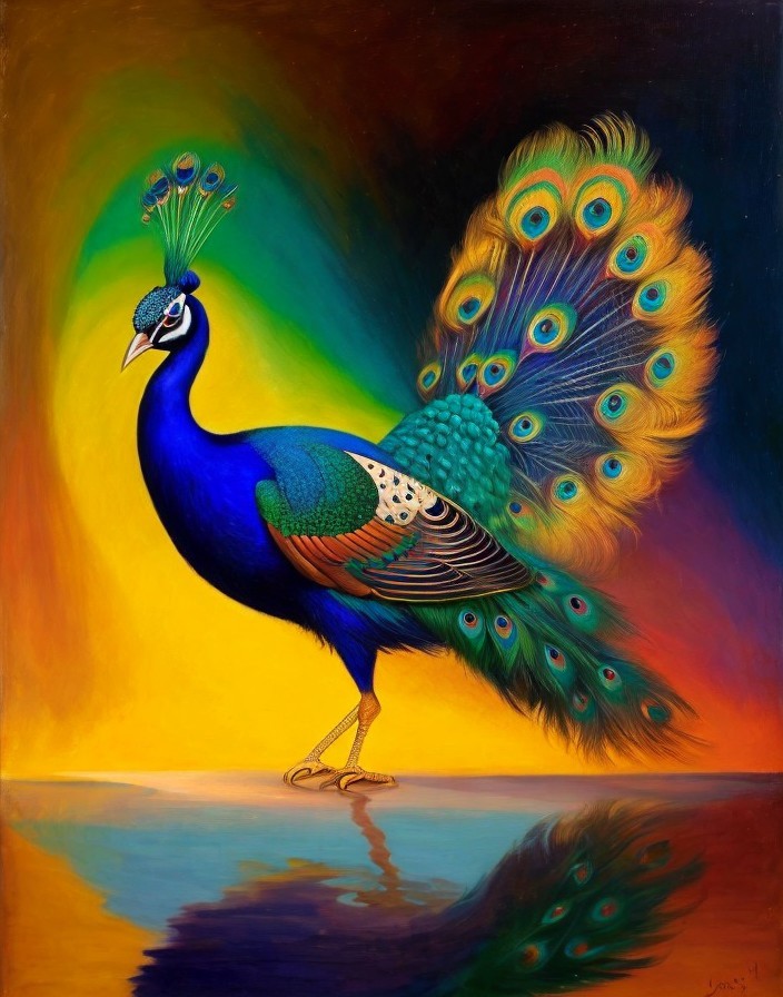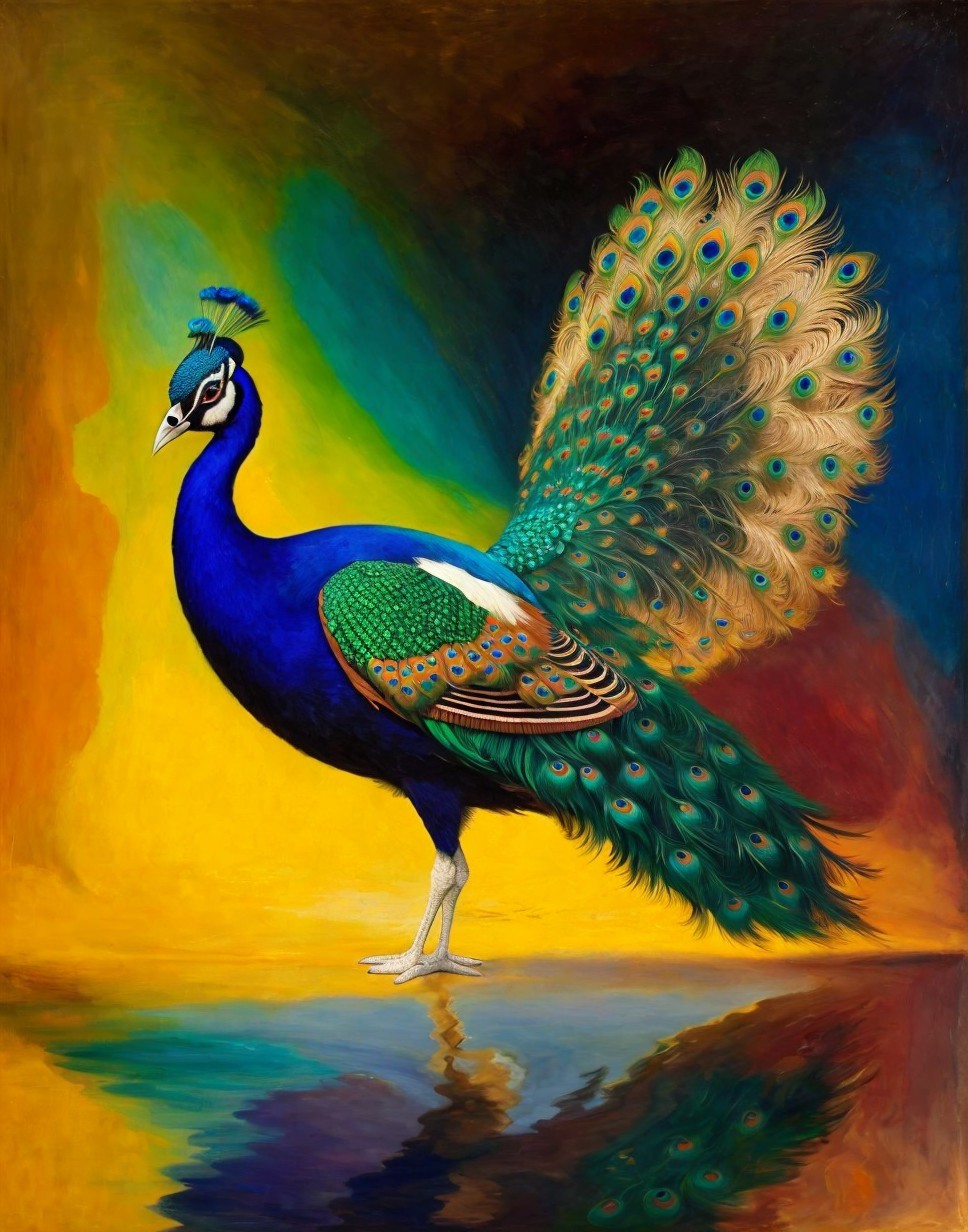 Colorful Peacock Painting with Blue and Green Plumage on Abstract Background