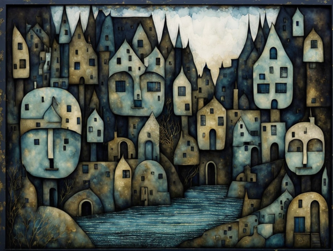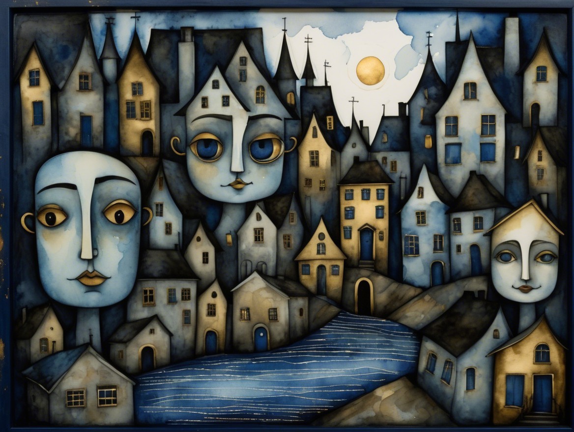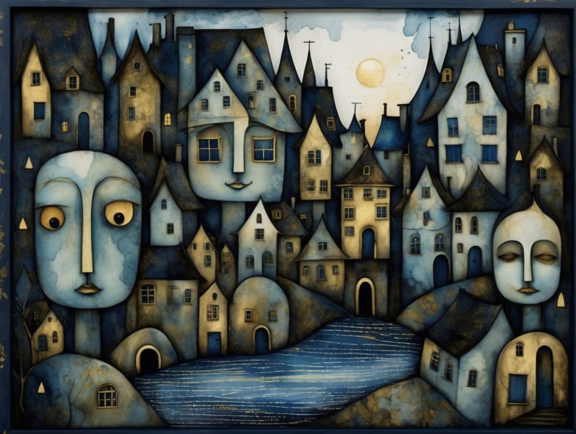 A whimsical, surreal scene featuring faces intertwined with abstract houses, set against a moonlit sky. Blues and golds dominate the palette, creating an enchanting, dreamlike atmosphere.