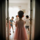 A boy in a pink dress stands at the door to his group and doesn't dare go in. He doesn't know how the other children will react when they see his dress.