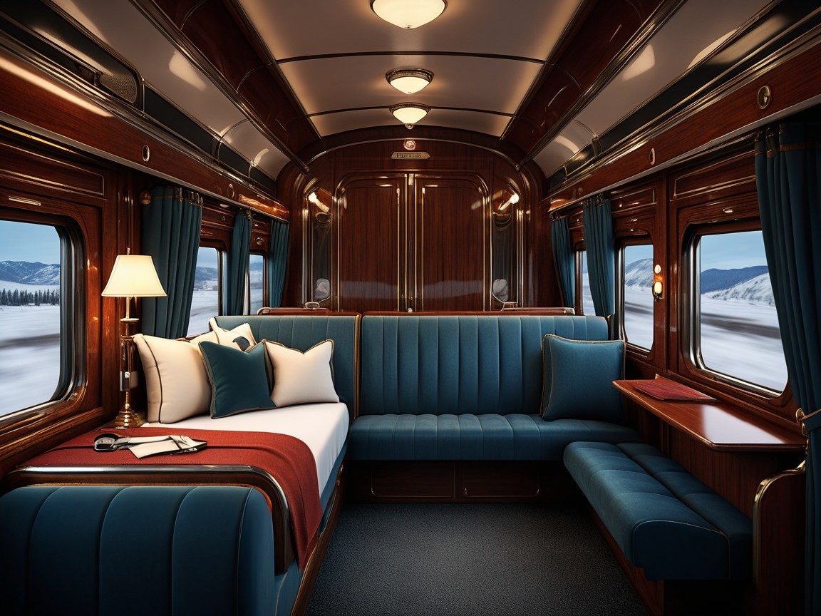 A luxurious train compartment with rich dark wood paneling, ornate brass accents, cream-colored ceiling with inset lights, and dark teal blue seating and curtains. On the left, a bed is made up with white sheets, a terracotta red throw, and a mix of cream and teal decorative pillows.