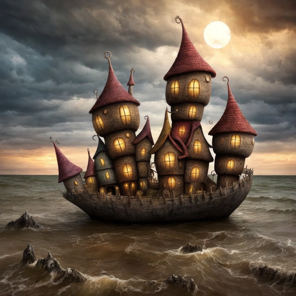 A surreal image of a towering castle with conical roofs above colorful houses against a stormy sea backdrop and a setting sun.
