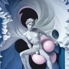 The artwork features a seated, nude figure with pale skin, surrounded by abstract shapes and dramatic contrasts of blue and pink. Clouds and circular forms create a surreal atmosphere.