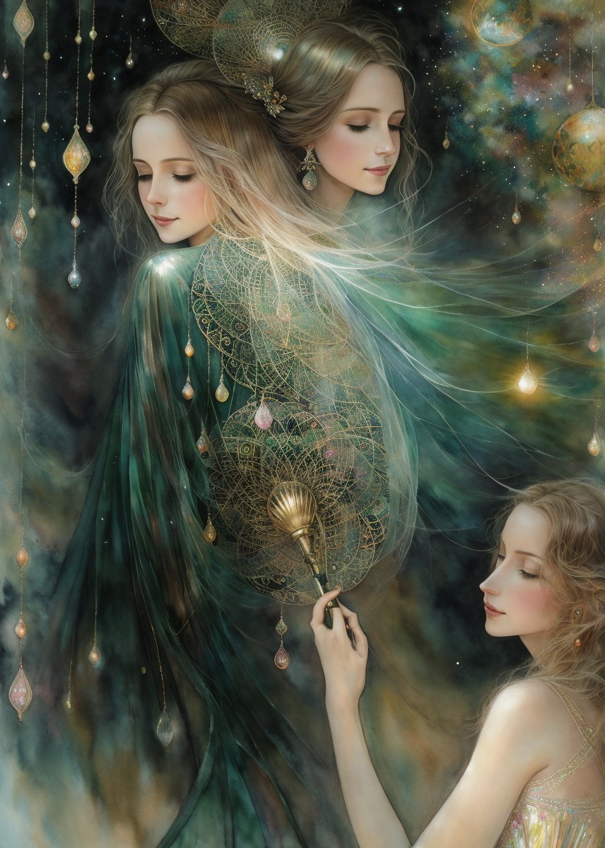 A fairy with glowing wings and a flowing blue dress gazes at a radiant orb in a starlit, arch-framed setting.
