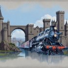 A whimsical scene depicts a large, textured pseudo fish with bright red accents near a medieval castle, while a small figure in a flowing dress walks along the water's edge under a cloudy sky.