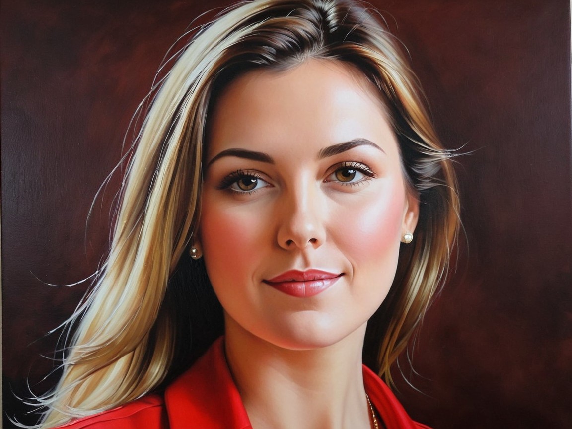 A realistic portrait of a young woman with long, flowing hair and a confident expression. She wears a red jacket and pearl earrings, set against a warm, rich background.