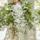 A bride holds a beautiful bouquet of white flowers and greenery, wearing a delicate, intricately designed gown with a deep neckline, set against a lush, green backdrop.