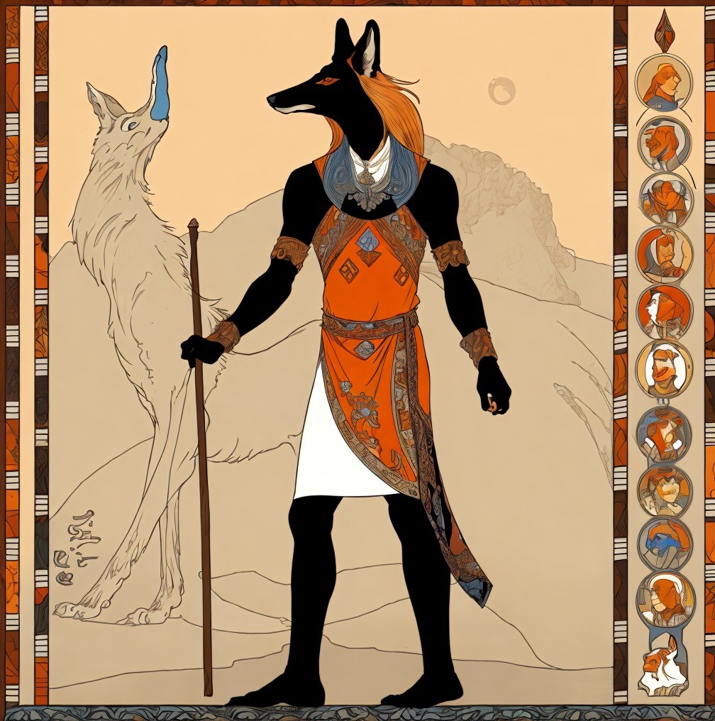 Anthropomorphic foxes in historical clothing with ornate fox-themed background.
