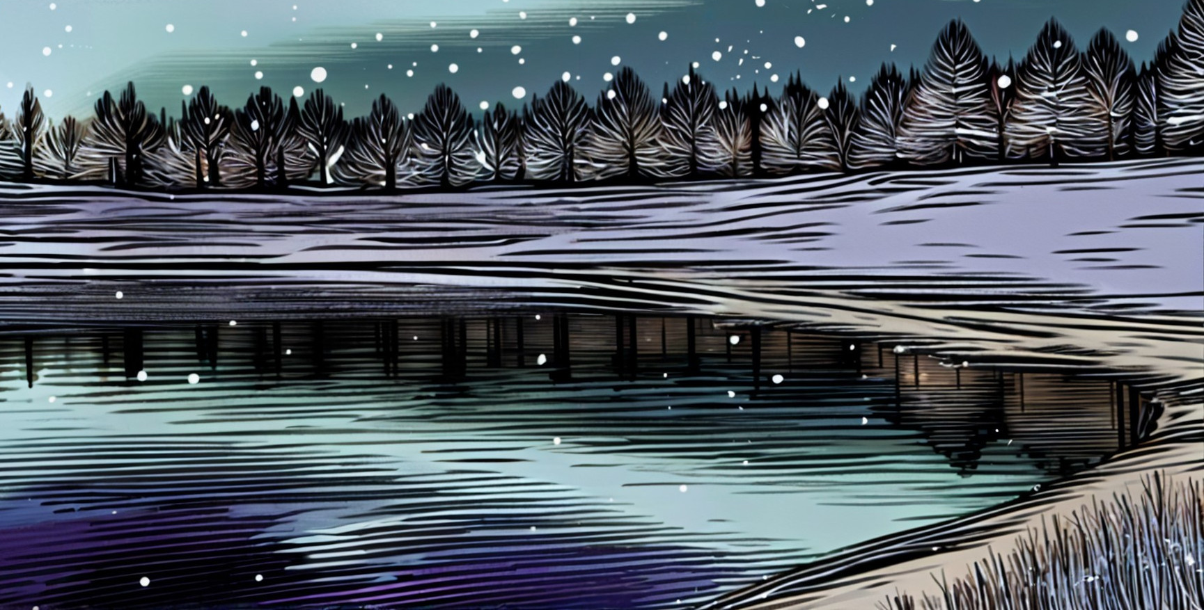 A serene winter scene featuring a tranquil lake surrounded by snow-covered trees. Soft snowflakes fall against a moody, greenish sky, reflecting gently on the water's surface.