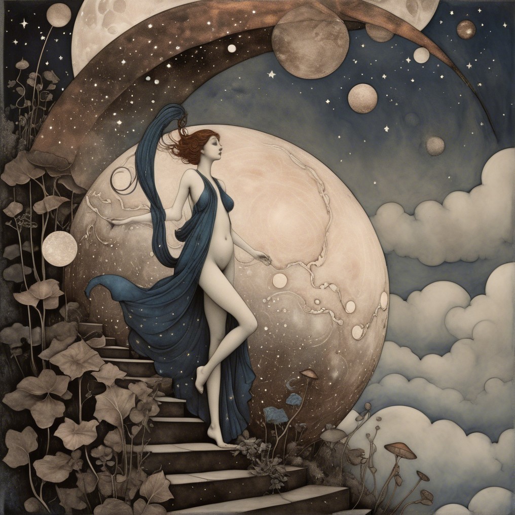 A surreal illustration of a woman draped in blue, with her hair flowing among celestial orbs and swirling galaxy patterns in a cosmic backdrop.