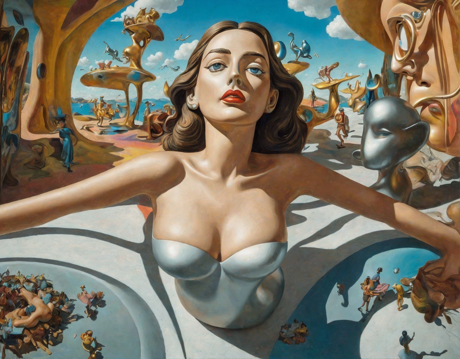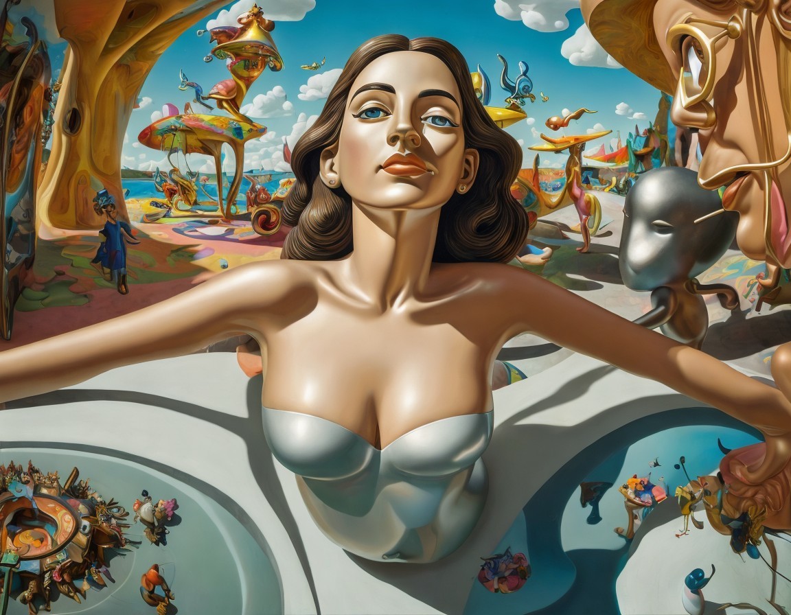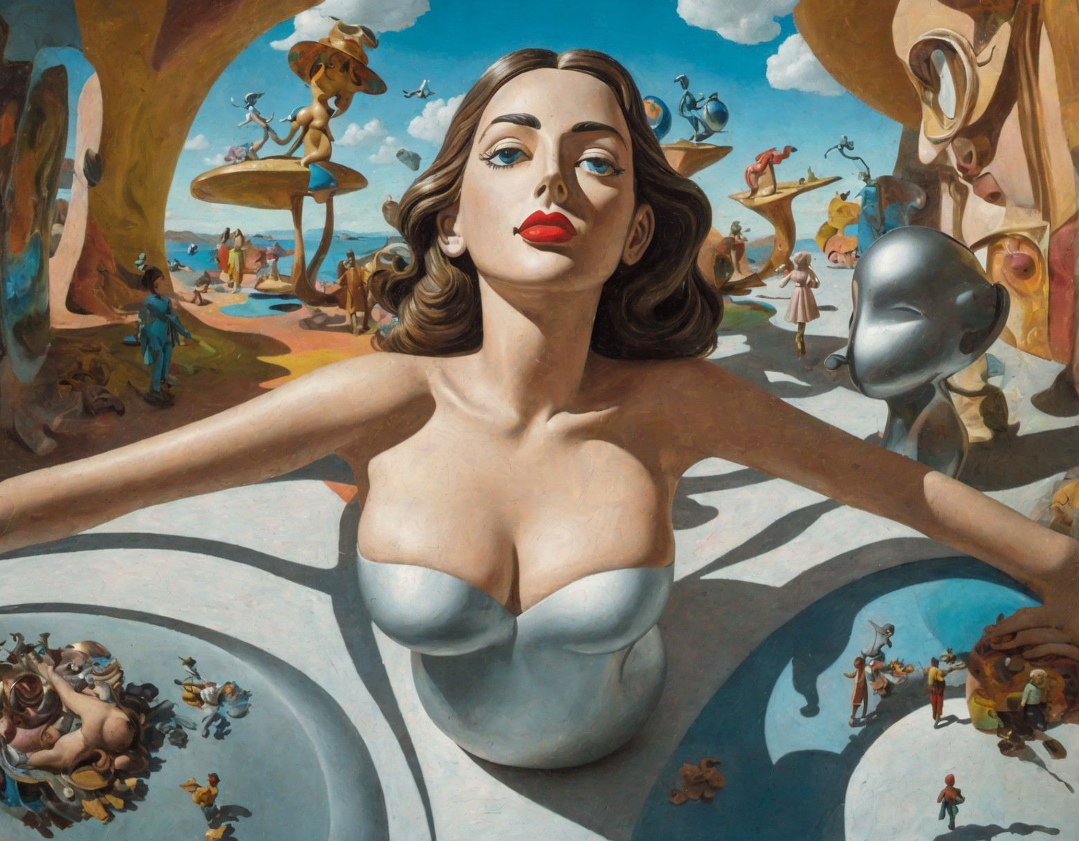 A surreal painting of a woman's face and upper torso with whimsical, disproportionate scenes and characters surrounding her.