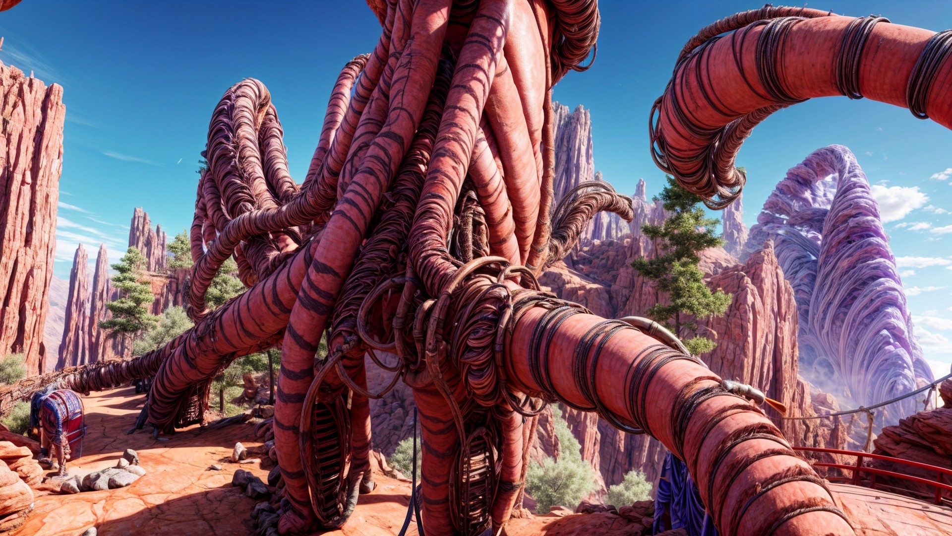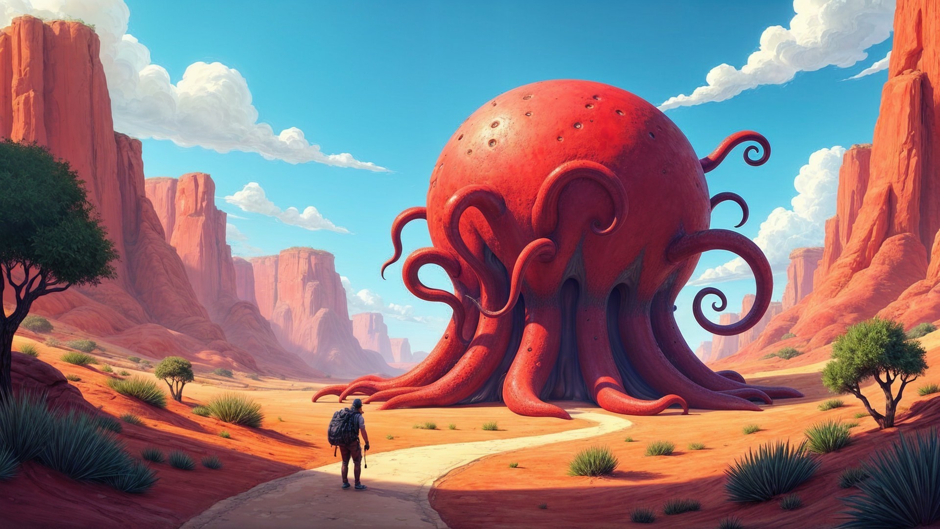 A giant, red jellyfish with tentacles stands in a desert landscape, while a person gazes up in awe. Monument Valley's iconic buttes rise in the background under a blue sky with fluffy clouds. They are common and generally harmless. I happened to get this picture a couple of years ago in Arizona.
