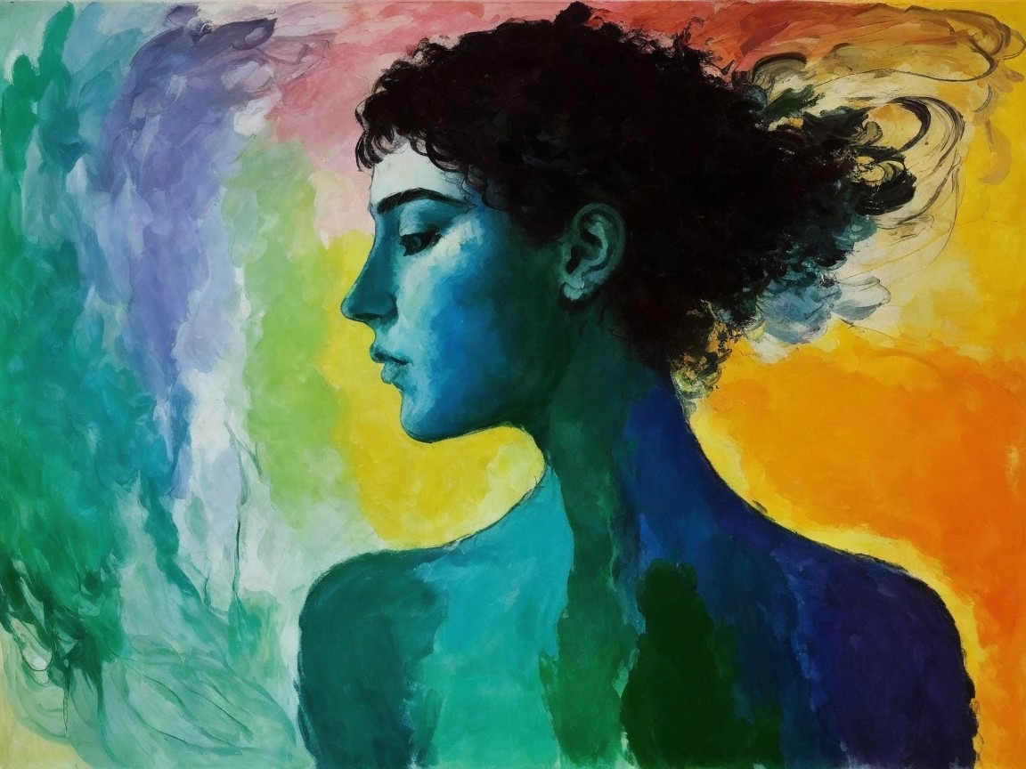 The artwork features a profile of a woman with a vibrant, multi-colored background. Bold brush strokes create a blend of blues and greens, contrasting with warm oranges and yellows, evoking emotion.
